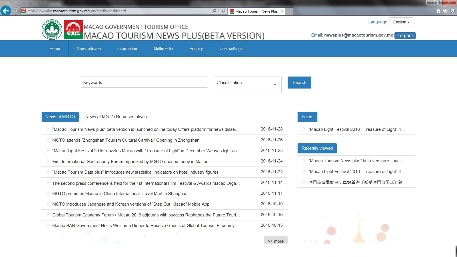 At present, journalists and editors working for local media agencies and overseas members of the press recommended by MGTO representatives (http://en.macaotourism.gov.mo/main/contactus.php) are welcome to register for a user account at the Macao Tourism News plus (http://newsplus.macaotourism.gov.mo). Based upon the status of operation, the Office will open up the platform to more media users, in hope that more members of the press can access the database of Macao tourism news and enjoy the service for free.