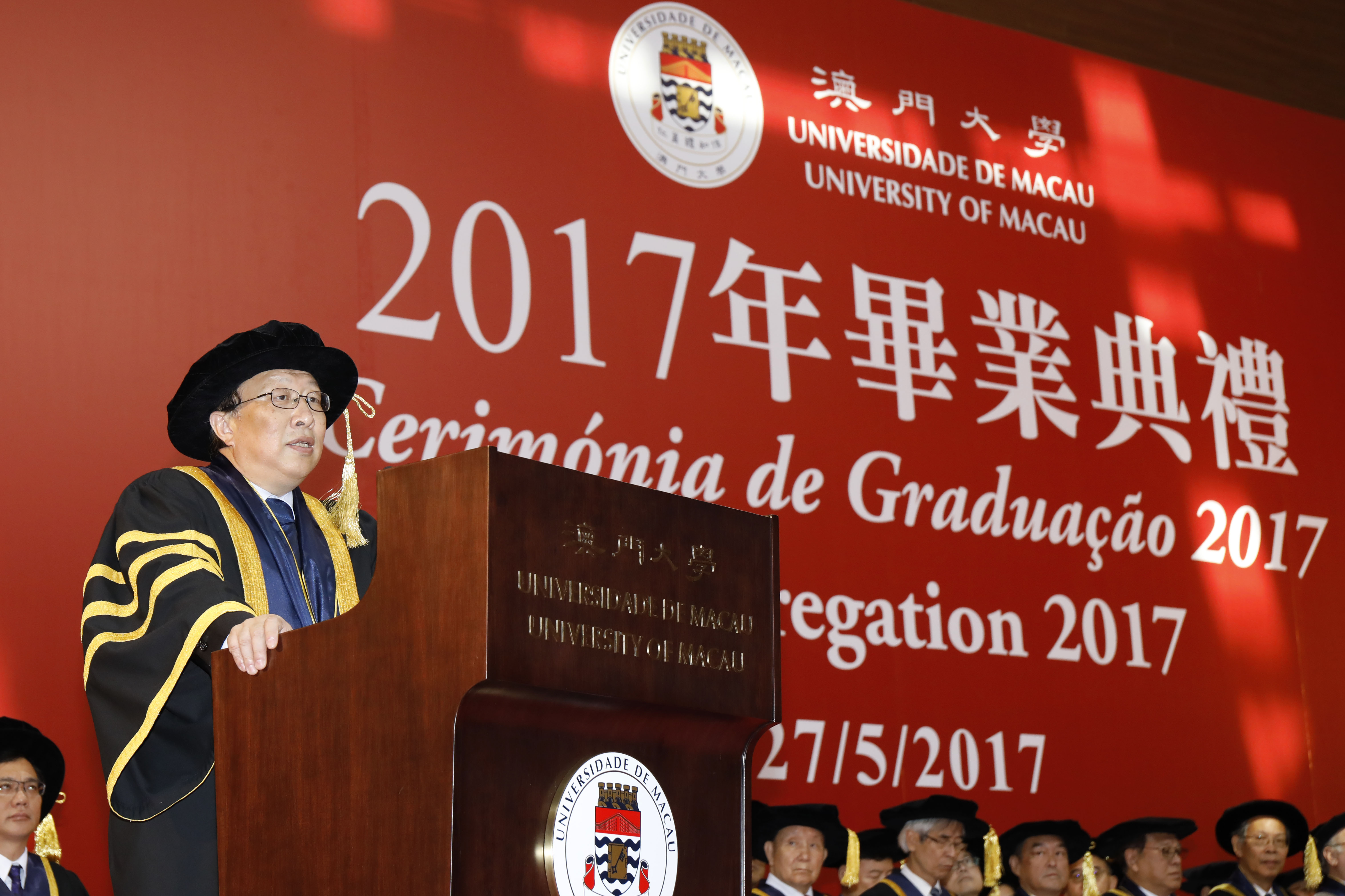 The University of Macau today (27 May) held the Congregation 2017. UM this year graduated 1,400 students. Chui Sai On, chief executive of Macao SAR and chancellor of UM, attended the ceremony. Chui said at the ceremony that today’s UM attaches importance to introducing high-calibre talent and actively joins the international higher education trend, adding that the university vigorously develops disciplines with potential and spares no effort in curriculum development in order to improve the quality of its education.