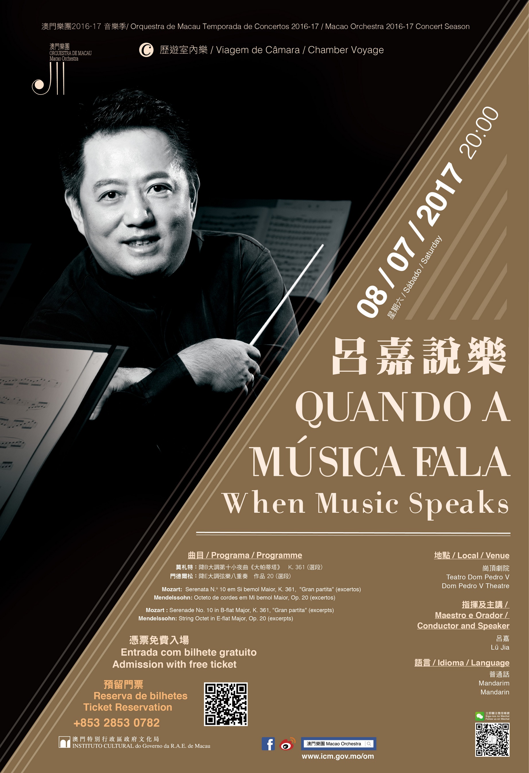 The Macao Orchestra (OM, from the Portuguese acronym), under the auspices of the Cultural Affairs Bureau, presents the concert “When Music Speaks”, part of the concert series “Music for All”, on Saturday, 8 July, at 8pm, at the Dom Pedro V Theatre. World-renowned conductor Lü Jia, OM’s Music Director and Principal Conductor, will meet music fans face-to-face and elaborate on chamber music of Mozart and Mendelssohn. Admission to the concert is free.