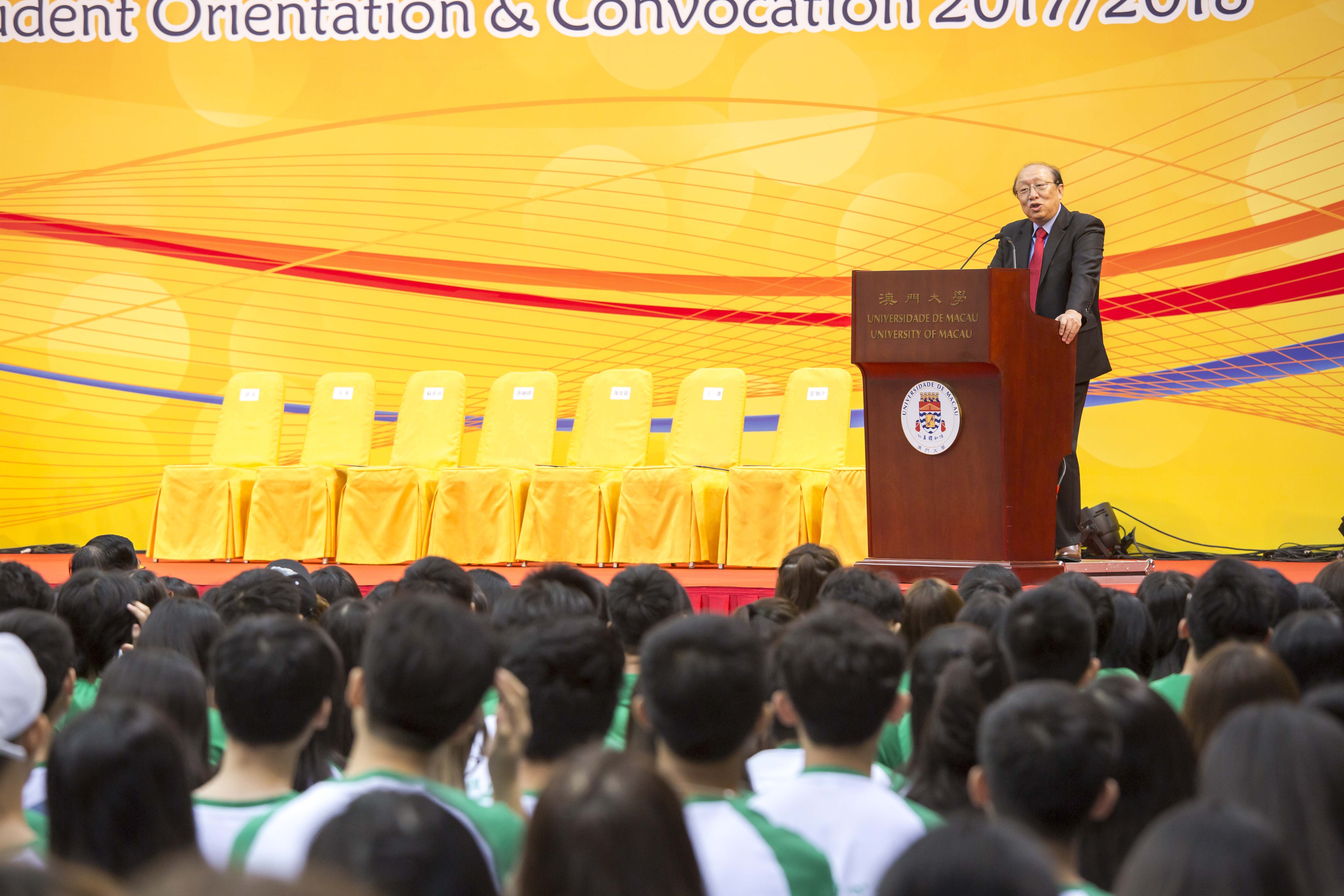 The University of Macau (UM) today (15 August) held the orientation and convocation for the 2017/2018 academic year to welcome more than 1,700 freshmen. UM Rector Wei Zhao gave the ‘first lecture at UM’ to the students, encouraging them to make the most of the ‘great buildings’ and ‘great professors’ at UM to acquire ‘great knowledge’ and ‘great character’, so they can rise up to the challenges of the 21st century.