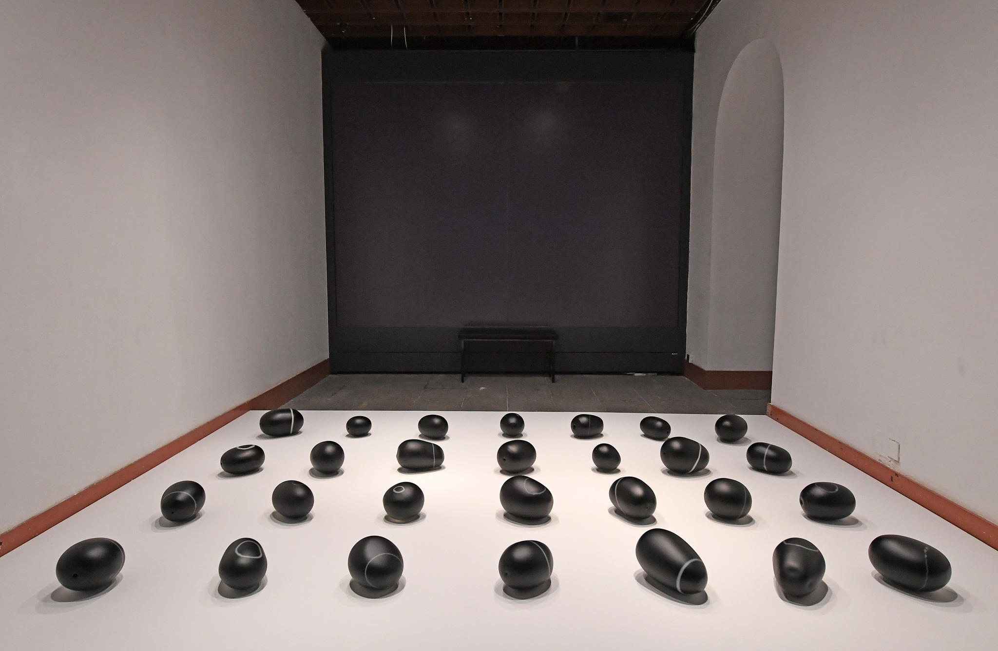 This exhibition features twenty pieces (sets) of Wang’s glass installations. Her works are rich in oriental cultural elements. Among them, the work “Poetic Stones” is inspired by the Buddhist ode of The Ten Ox-herding Pictures and ancient Chinese phonology. Twenty-eight black stone-shaped glass of different shapes and sizes are displayed in four rows with seven in each row, corresponding to the rhythm of seven words quatrains. She uses lines at her works, making large circles as the level tone, while small circles as the oblique tone. Each circle refers to a moment, a stone refers to a rhyme. There is no way back and no interval in the course of glassblowing, just like calligraphy writing. The creation process has to be completed without interval and reversal, corresponding with the artist’s perception of “living at the moment”.