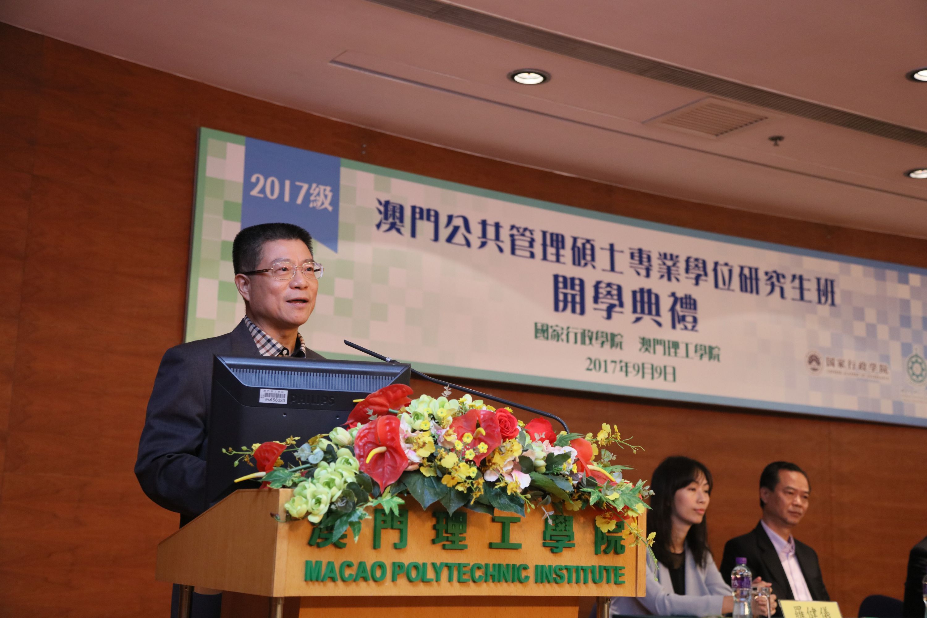 The opening ceremony for students entering the Master of Public Administration (MPA) programme in 2017 was held at Macao Polytechnic Institute (MPI) at 10am on 9th September. The programme is jointly offered by the Chinese Academy of Governance and MPI with the support of the Public Administration and Civil Service Bureau of the Macao SAR. Guests attending the ceremony included Professor Zhu Guoren, Director of the Department of Graduate Education of the Chinese Academy of Governance; Mr. Liu Dongsong, Deputy Director of the Training Centre of the Liaison Office of the Central People's Government in the Macao SAR; Professor Lei Heong Iok, President of MPI and Ms. Lo Kin I, Deputy Director of the Public Administration and Civil Service Bureau. In their officiating speeches, Professor Zhu, President Lei and Ms. Lo encouraged students to work very hard in their studies and research. They expressed their hopes for students to excel as public administration professionals and contribute their expertise to the Macao SAR. The Master of Public Administration, which was first offered in 2009, aims to cultivate high-calibre, application-oriented public administration professionals who can serve in the Macao SAR government by applying the knowledge and practical experience gained in their studies. This programme also equips students with an understanding of societal developments, allowing them to carry out their administrative duties in compliance with the law. Delivered on a part-time basis to cater for students who are in full-time employment, the Chinese Academy of Governance designs the overall programme scheme, assigns teaching materials and teachers, and also conducts course assessments and evaluations. On the other hand, Macao Polytechnic Institute is responsible for providing classrooms and course management. It also provides assistance related to teaching and evaluation. The Chinese Academy of Governance will award the Master of Public Administration (MPA) degree to students who have completed all programme requirements and passed an oral defense. Eight batches of 444 students have begun their studies in the MPA programme, of which 306 have passed their oral defense and obtained a Master’s degree. This year, 40 students have been accepted to this programme.