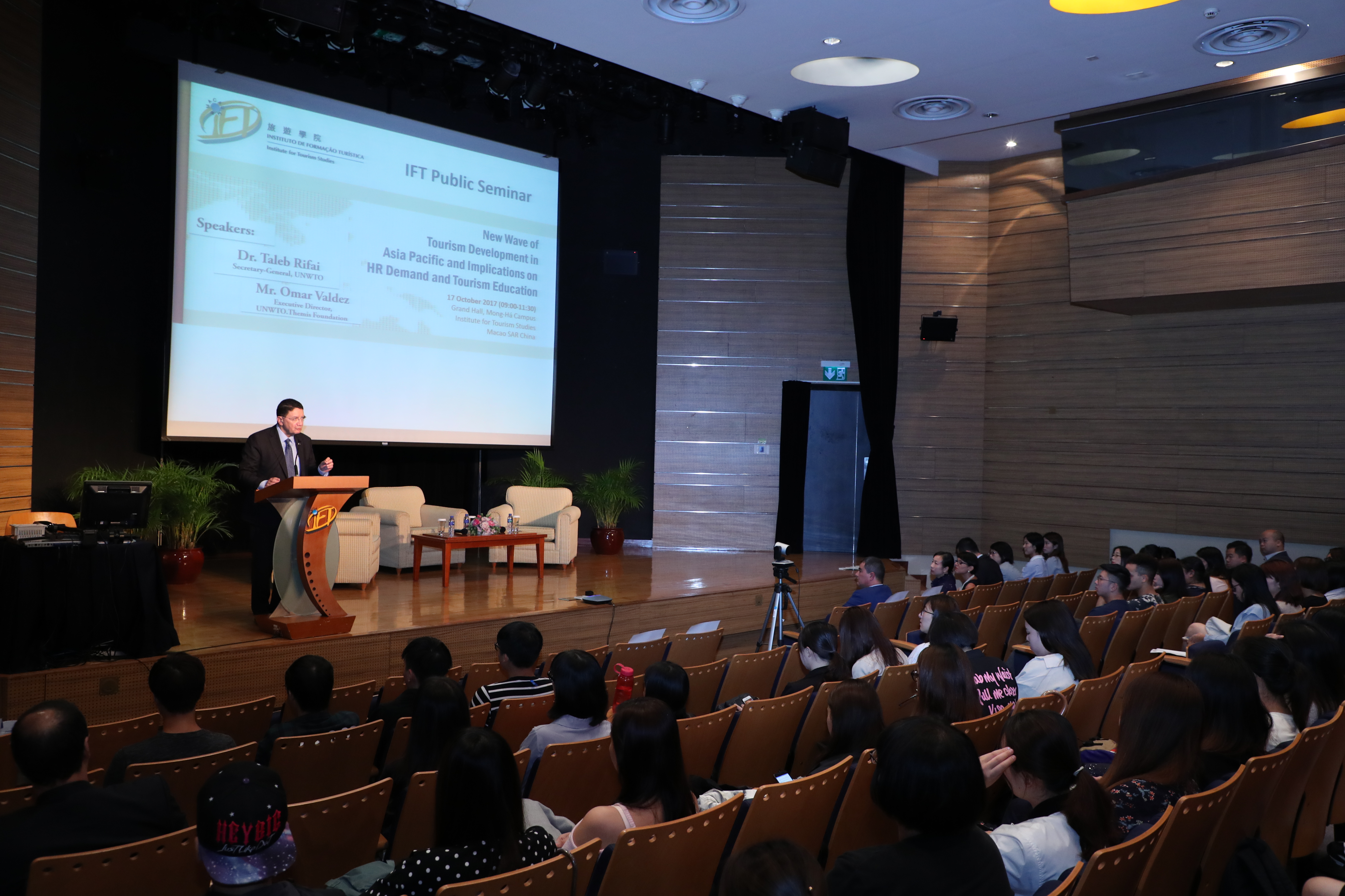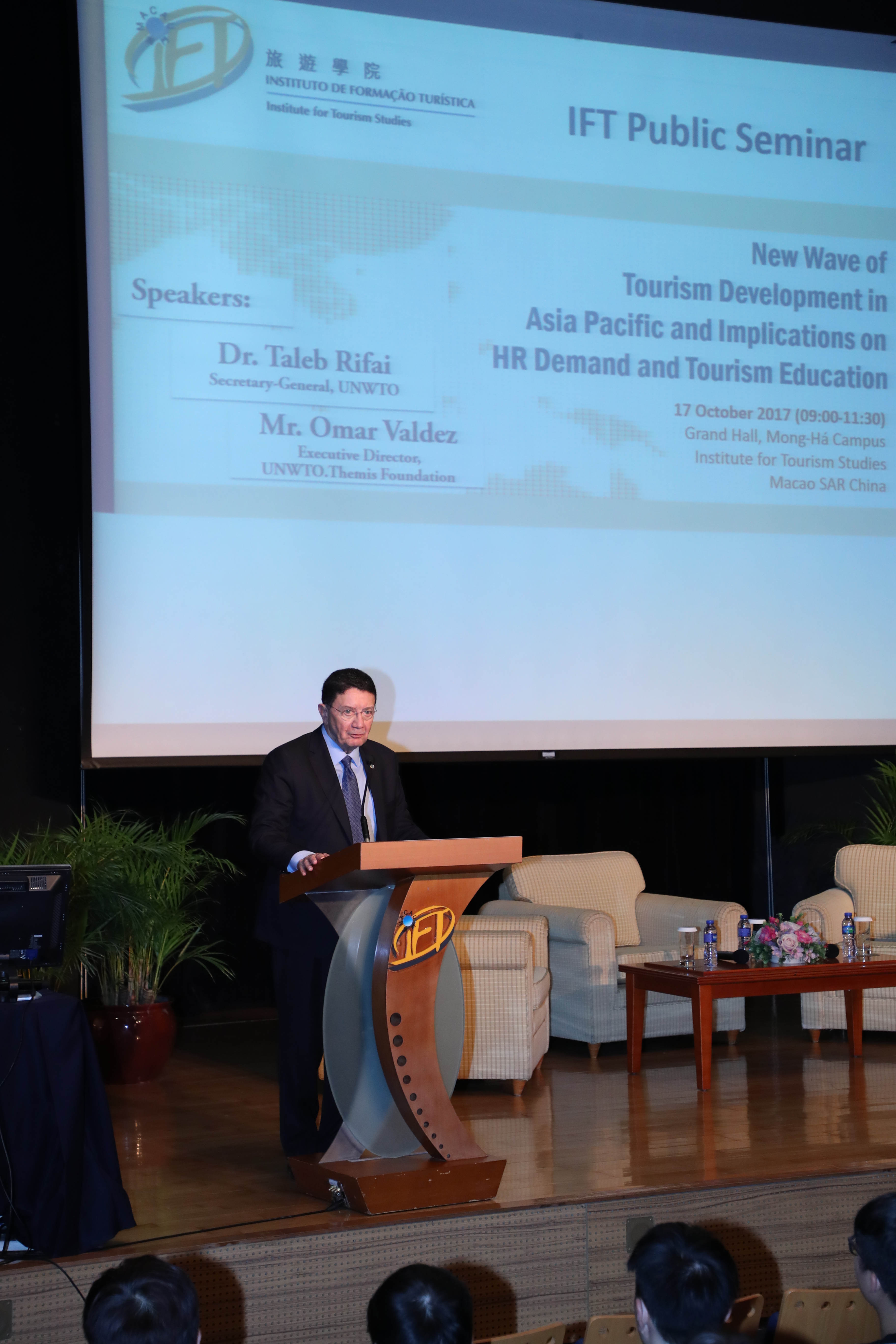 On 17 October, the Institute for Tourism Studies(IFT) held a public seminar with the World Tourism Organisation (UNWTO) on tourism development in Asia Pacific, human resources demand and tourism education. Secretary-General of World Tourism Organisation(UNWTO), Dr. Taleb Rifai, and Executive Director of UNWTO. Themis Foundation, Mr. Omar Valdez were the keynote speakers.