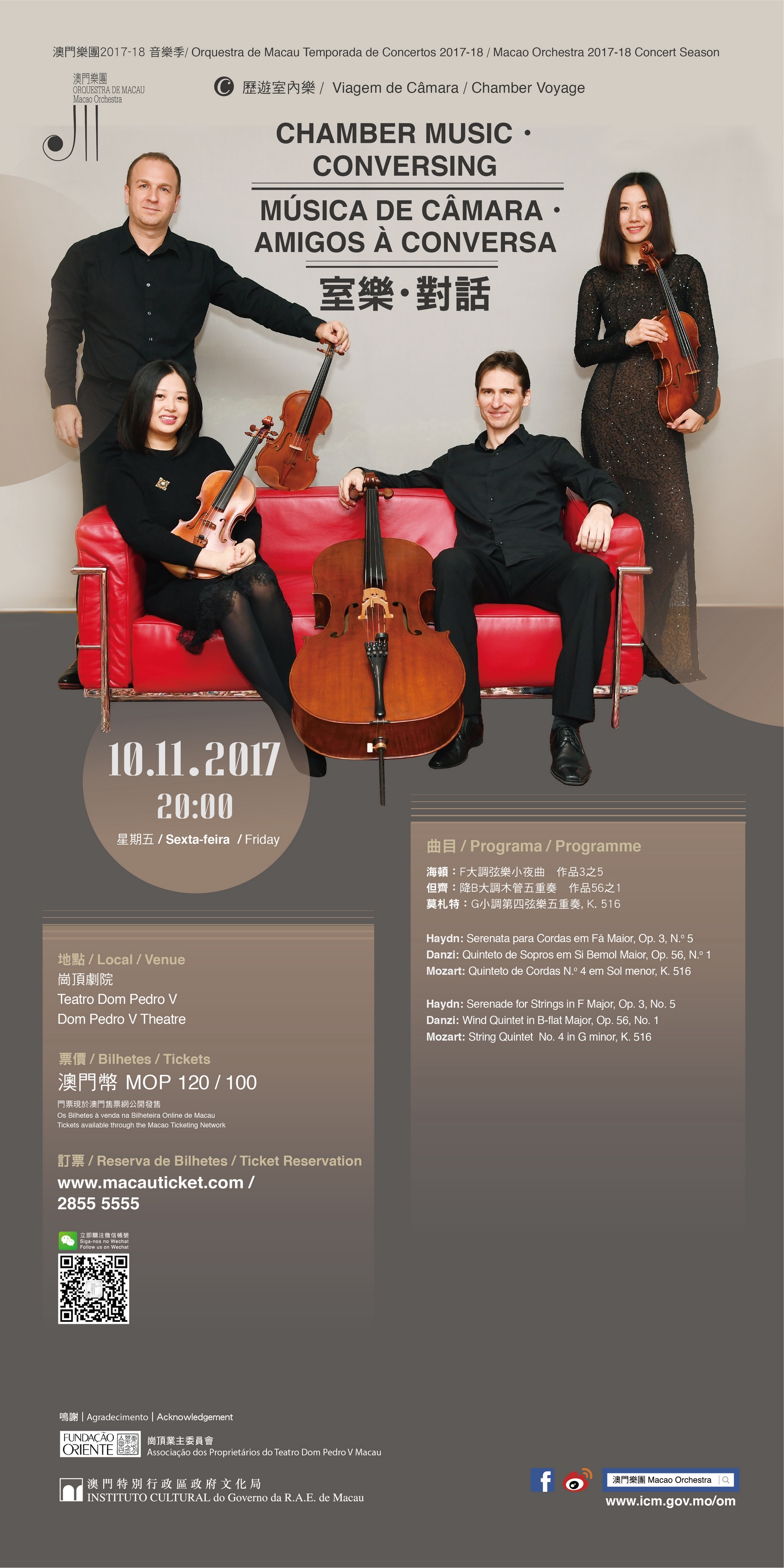 The Macao Orchestra (OM), under the auspices of the Cultural Affairs Bureau, presents the chamber music concert “Chamber Music.Conversing” at the Dom Pedro V Theatre on Friday, 10 November, at 8pm, featuring three pieces of chamber music from the Classical Period. Tickets are now available at the Macau Ticketing Network.