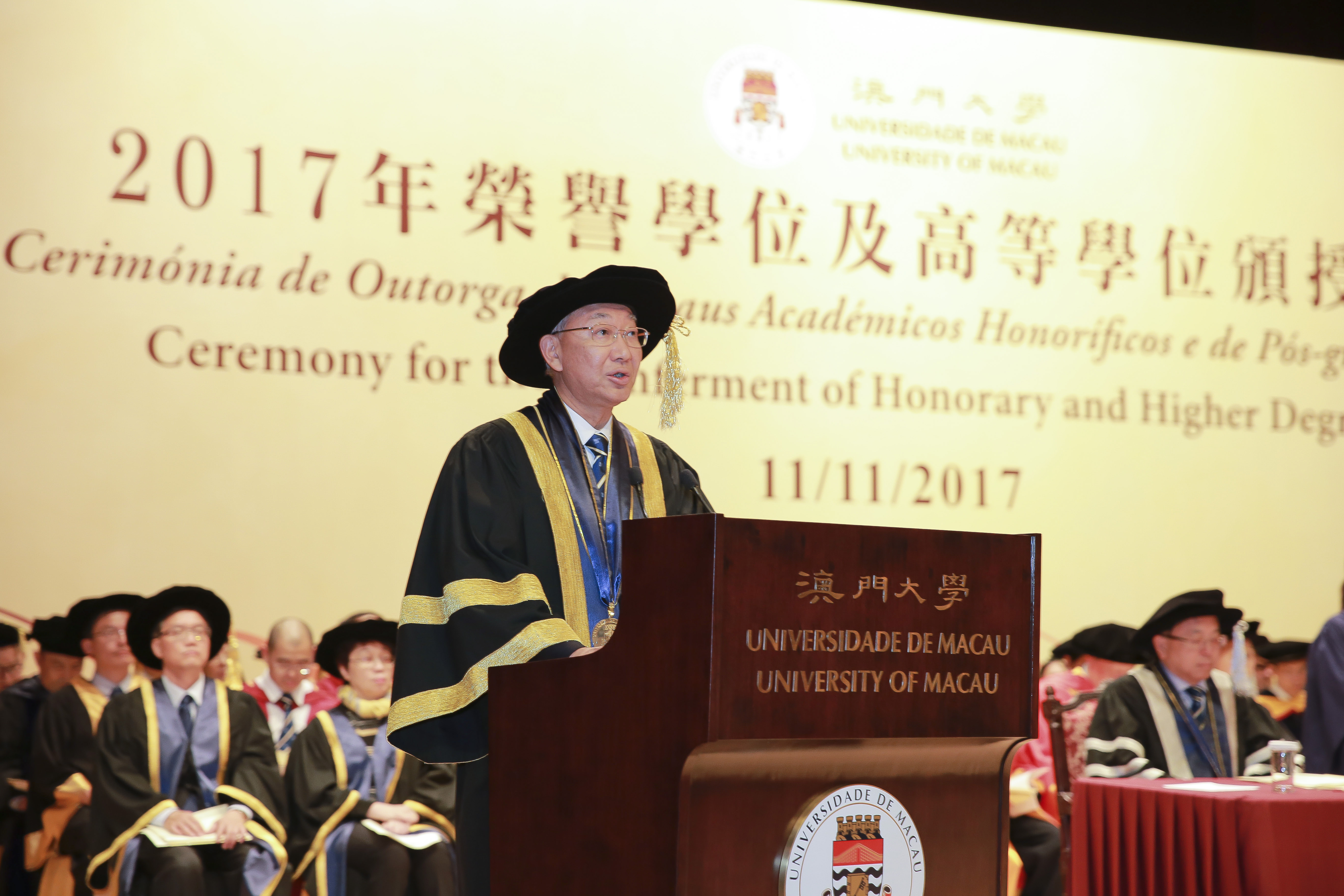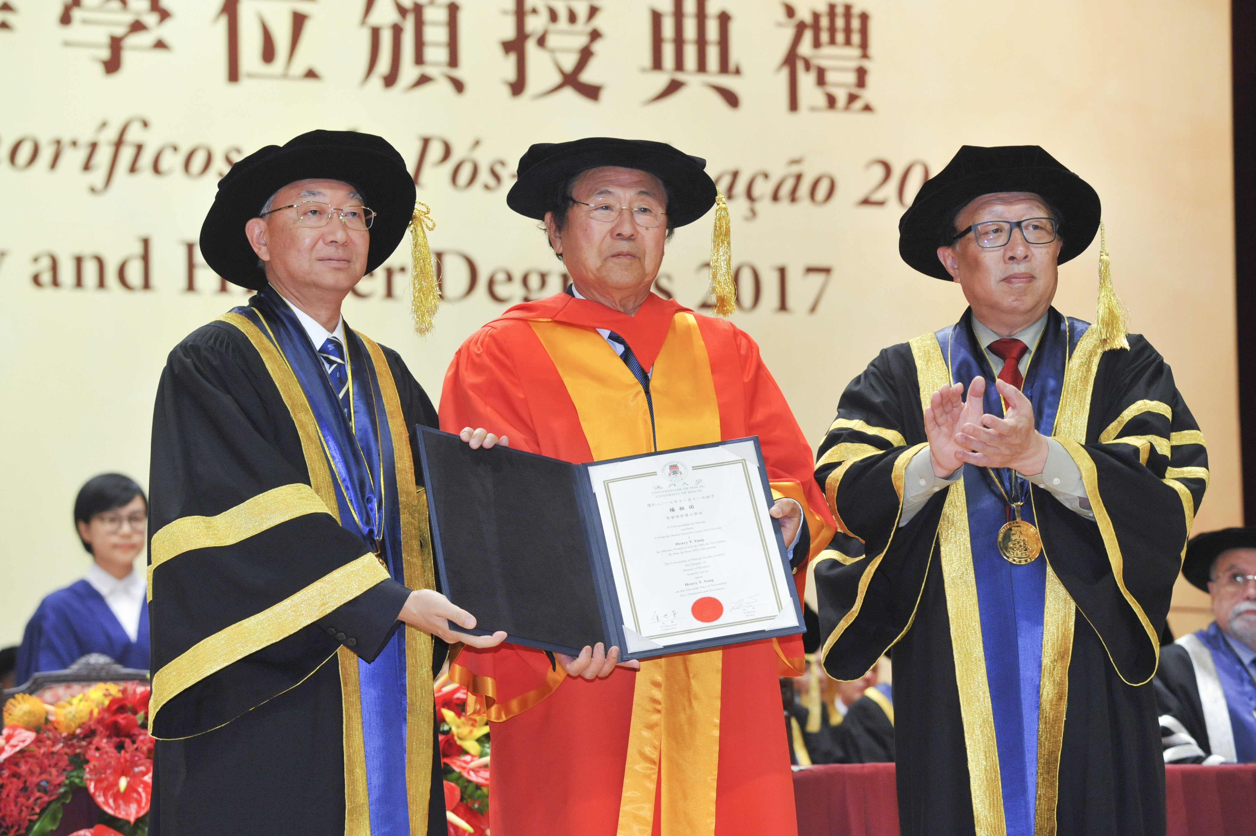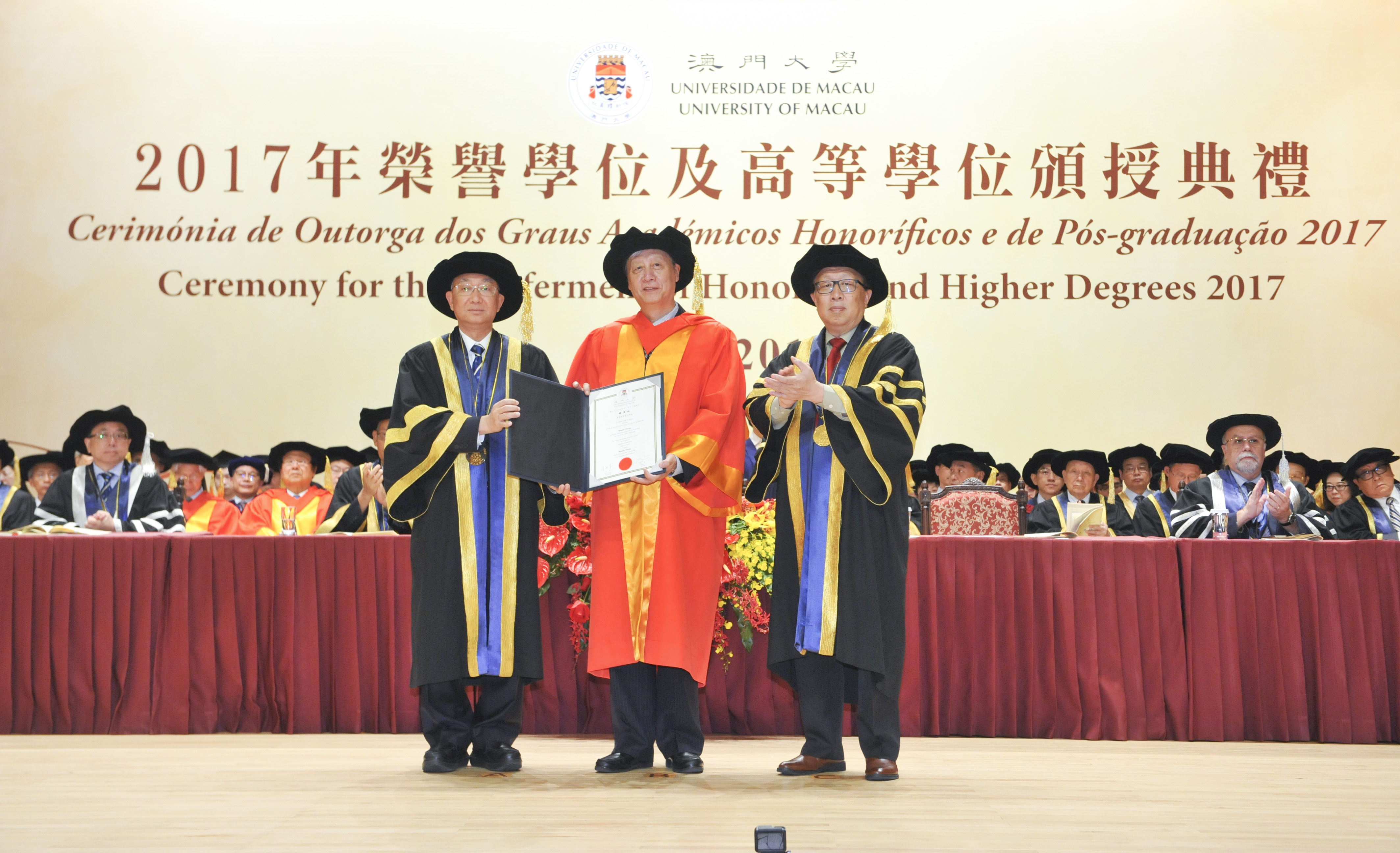 The University of Macau (UM) today (11 November) held the Ceremony for the Conferment of Honorary and Higher Degrees 2017. During the ceremony, the university conferred honorary doctorates on Academician He Jingtang, a representative figure in the Chinese school of architecture; Professor Henry T. Yang, a world-renowned expert in structural engineering; and Professor Binglin Zhong, a well-known educationalist, in recognition of their outstanding achievements and significant contributions to society and education.