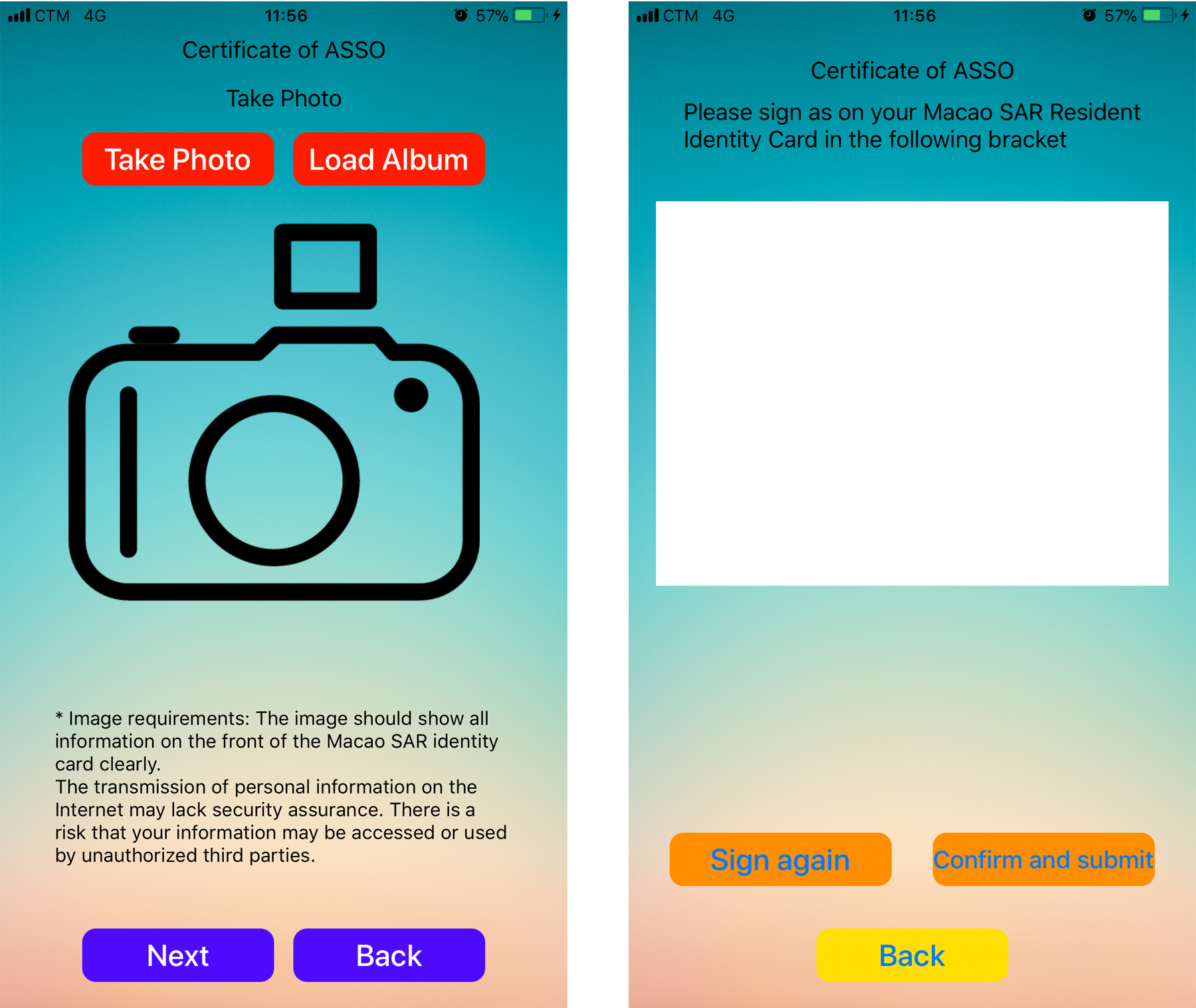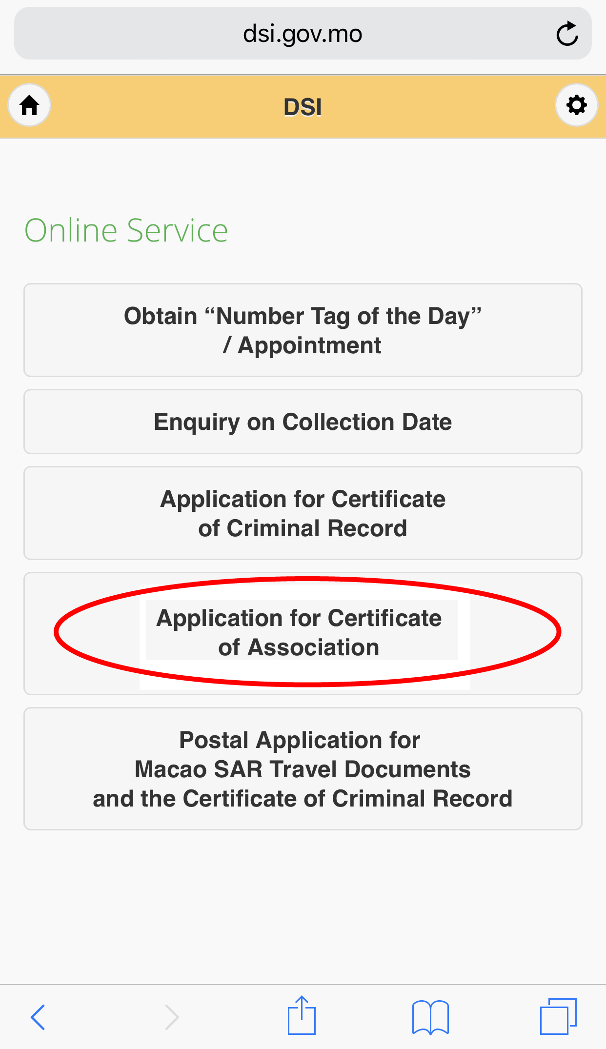After downloading the mobile application, applicants can go to the “Online Services” zone of DSI’s website and click the “Application for Certificate of Association” button to enter the system to lodge the application. Firstly, applicants need to confirm their email address, and then follow the system instructions to operate and input data. After that, they have to use the mobile application to provide the image of the front side of their identity card and their signature. Lastly, applicants have to pay online, download and print the application receipt to finish the application procedures. Applicants can visit DSI’s website (www.dsi.gov.mo/video/assoOnline.mp4) for watching the demonstration video of the above-mentioned service.