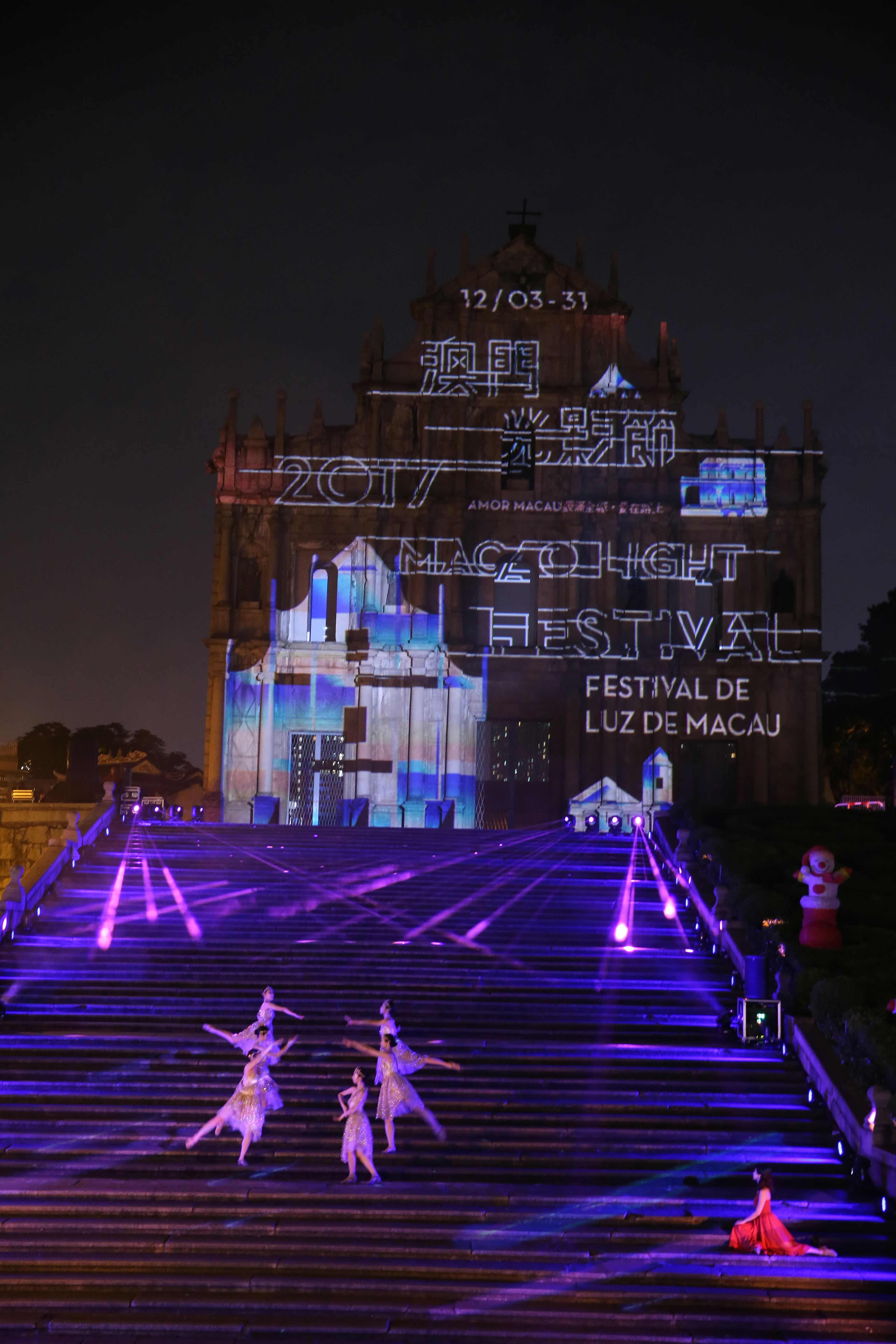 “Macao Light Festival 2017 – AMOR MACAU” was splendidly unveiled at the Ruins of St. Paul’s tonight (3rd December) as an event organized by Macao Government Tourism Office (MGTO) and co-organized by Civic and Municipal Affairs Bureau, Cultural Affairs Bureau and Sports Bureau, as well as shaped by the collective artistry of over a hundred local transmedia creators. Under the theme “Wish-Making under the Stars”, the opening ceremony features dance performance choreographed and performed by a local dance troupe. The opening kicked off an array of projection mapping shows, light installations and interactive games at eight local attractions, taking visitors and residents onto a dazzling journey in search of love and dreams.