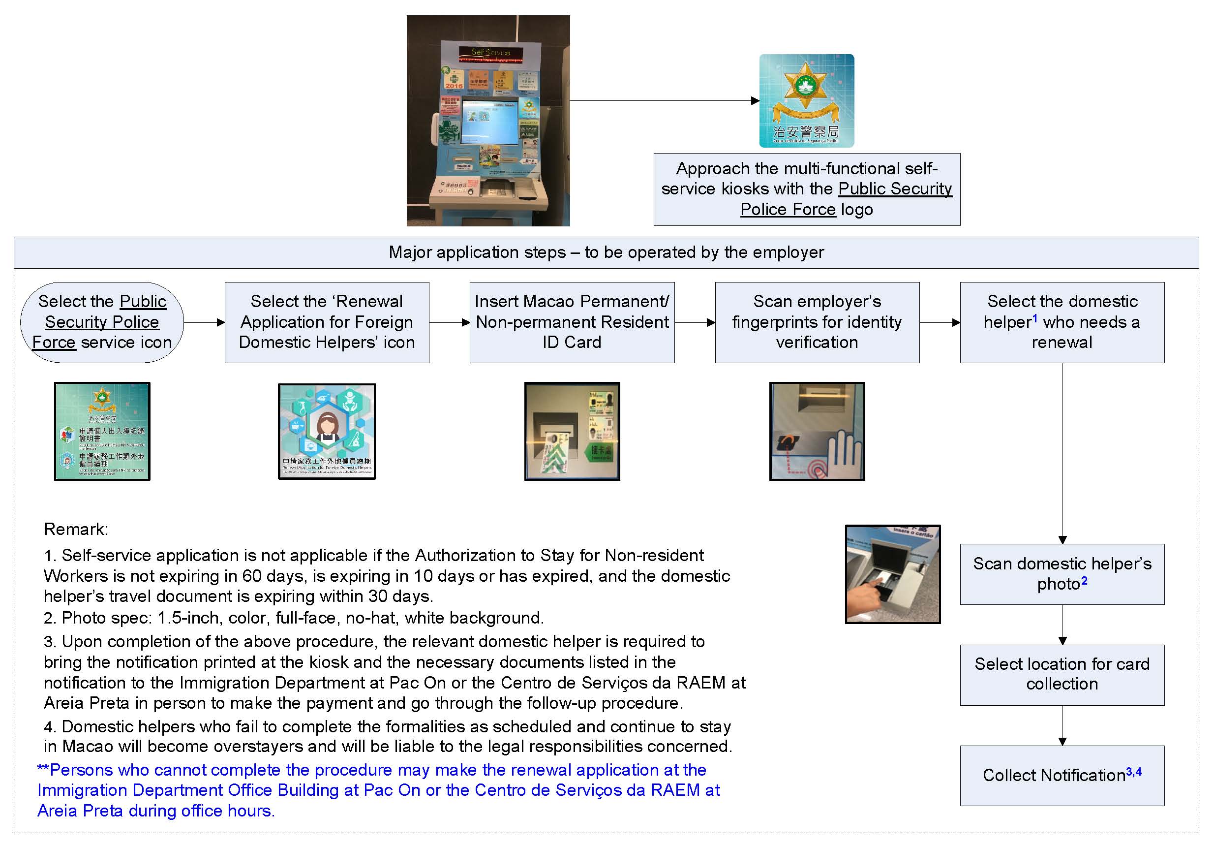 In 2017, the three departments collaborated again to introduce the self-service of renewal application for domestic helpers. Starting from 09H00 on 6 December 2017, Macao residents can make renewal application for their domestic helpers at over 40 locations, including the Border Checkpoint at the Border Gate, the Immigration Department Office Building, the lobby of the China Plaza, the self-service zone at the Centro de Serviços da RAEM at Areia Preta, all health centres, etc. Some locations are even open to public round the clock. In this way, over 24,000 employers and their domestic helpers will benefit from the new measures. The employers may submit the application at the self-service kiosks within 11 to 60 days before the expiry of the domestic helper’s ‘Authorization to Stay for Non-resident Workers’ by verifying their identity with the Macao ID card and following the steps below. Then the domestic helper can complete the follow-up procedure and be granted new ‘Authorization to Stay for Non-resident Workers’ by approaching the Immigration Department Office Building at Pac On or the Centro de Serviços da RAEM at Areia Preta with the notification printed at the self-service kiosks and the necessary documents listed in the notification. The employers can choose to make the renewal application by self-service or at the above two government buildings.