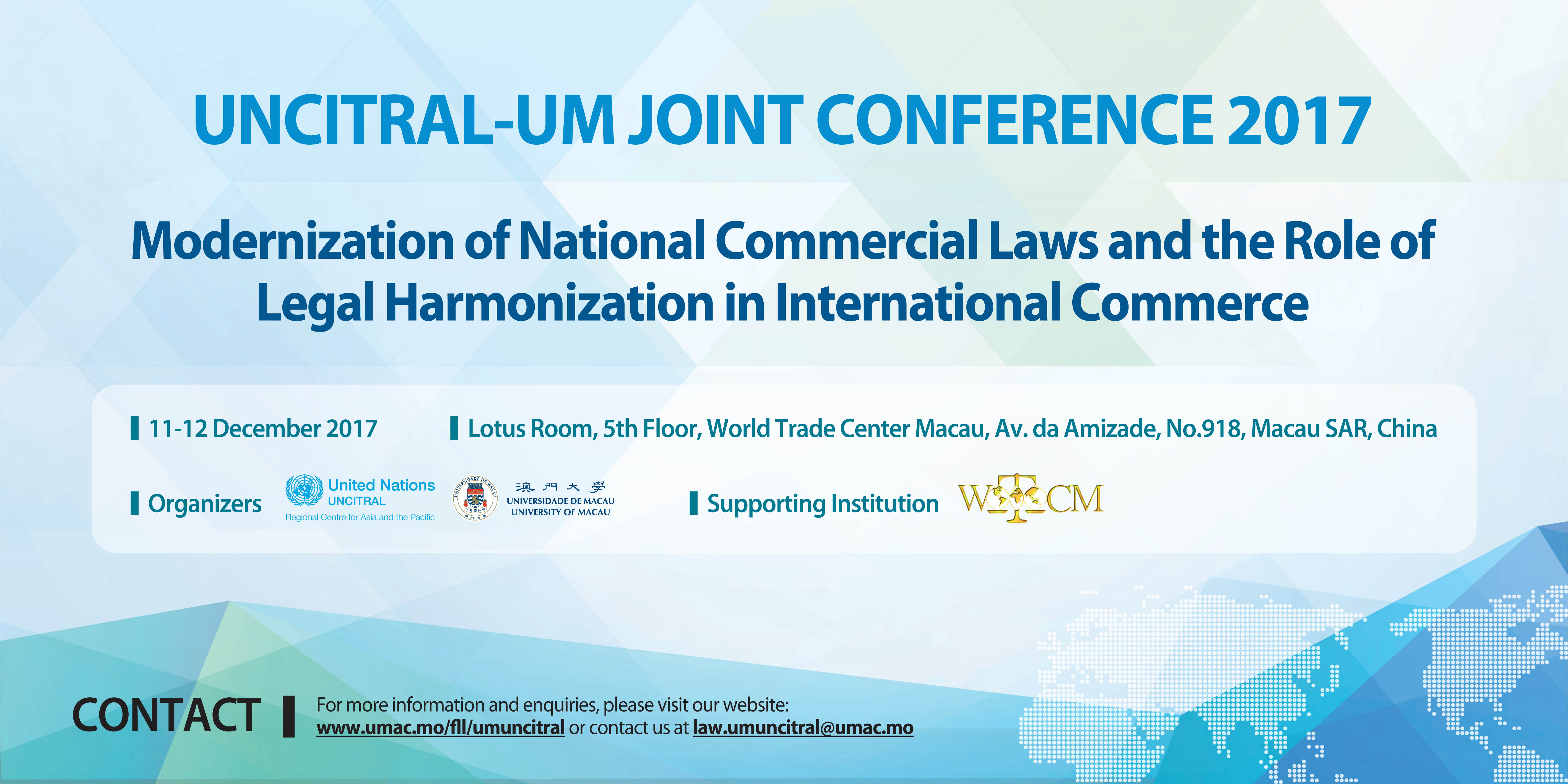The UNCITRAL-UM Joint Conference 2017 titled ‘Modernisation of National Commercial Laws and the Role of Legal Harmonisation in International Commerce’ will be held on 11 December and 12 December in the Lotus Room of the World Trade Center Macau. The event is co-organised by the University of Macau (UM) and the United Nations Commission on International Trade Law (UNCITRAL). This year’s event also receives support from World Trade Center Macau.