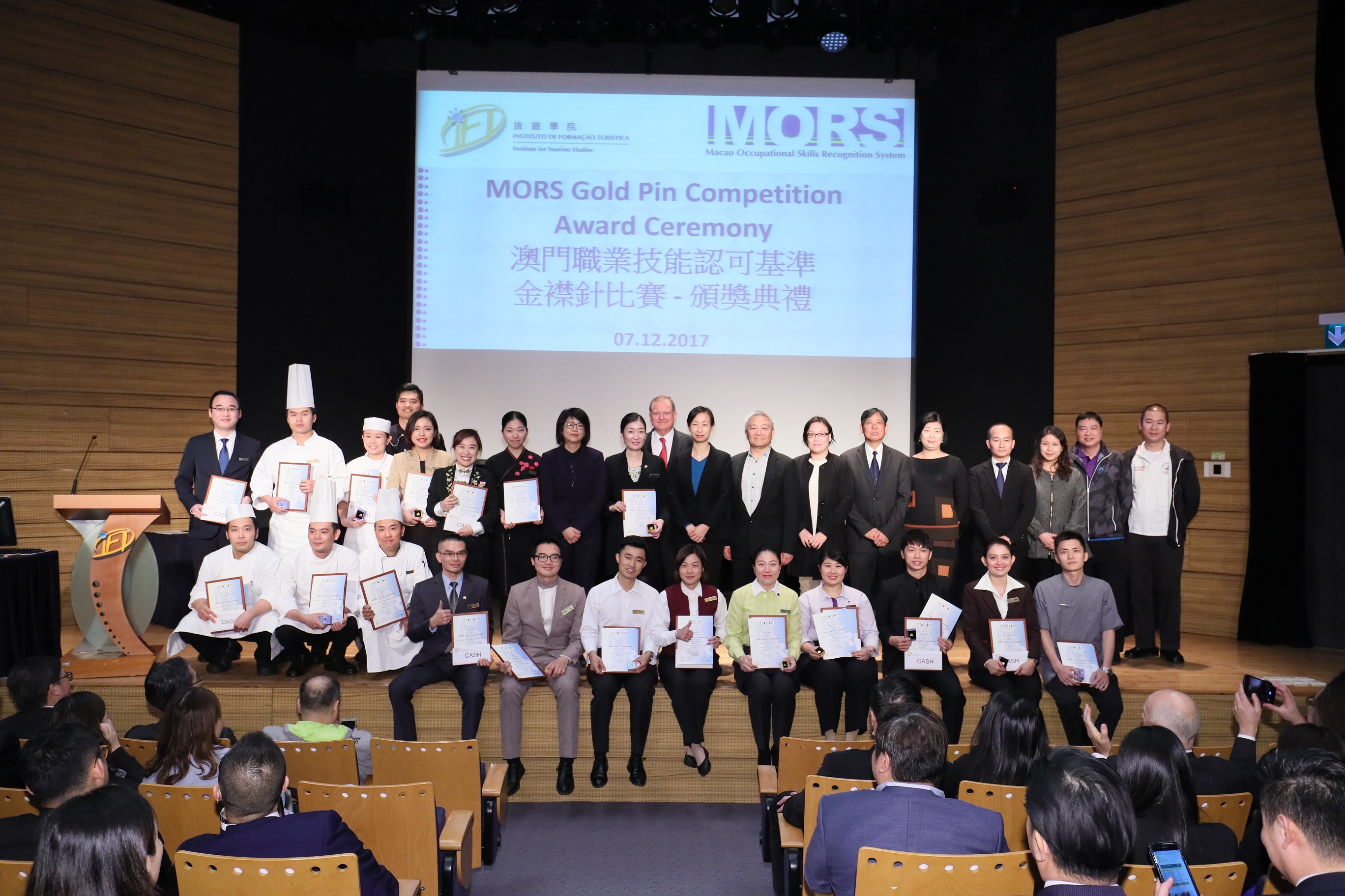 The 2017 “Macao Occupational Skills Recognition System” (MORS) Gold Pin Competition Award Presentation Ceremony was held today at the Institute for Tourism Studies (IFT). Ms. Ng Wai Han, Deputy Director of Labour Affairs Bureau, Mr. Chong Cheok Ip, Acting Head of Licensing and Inspections Department of Macao Government Tourism Office, Mr. William Visser, General Manager of Grand Lisboa Hotel, Mr. Chan Chak Mo, President of the United Association of Food and Beverage Merchants of Macao and Mr. Lei Pou Loi, President of Macao Hotel Employees Association presented awards to the winners.