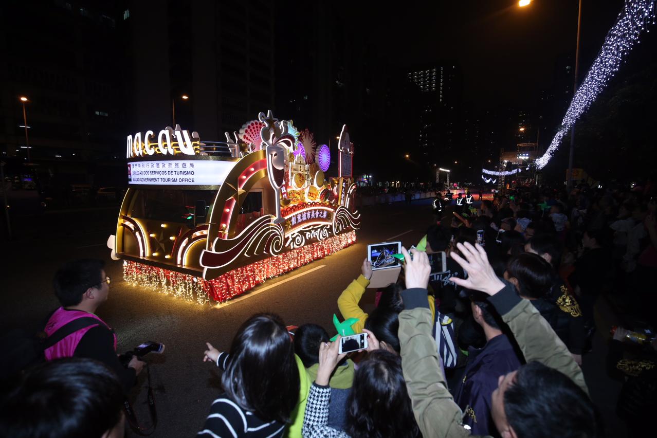 Presented by China National Tourism Administration, Macao Government Tourism Office, Civic and Municipal Affairs Bureau, Cultural Affairs Bureau, Sports Bureau, Galaxy Entertainment Group, Suncity Group, Sands Resorts Macao, MGM, Wynn Macau, Limited, Tak Chun Group, UO Group, Sociedade de Jogos de Macao, S.A., Multinational (Holdings) Group and Melco Resorts & Entertainment Limited, the 15 splendid floats set off from Rua Norte do Patane to glide along Avenida do Conselheiro Borja, Estrada do Arco, Estrada da Areia Preta, Avenida de Venceslau de Morais, Rua Quatro do Bairro da Areia Preta, Avenida da Longevidade, Rua do Mercado de Iao Hon until Iao Hon Market Garden. Souvenirs were distributed along the route to boost the festive vibe and joy experienced by the crowds.