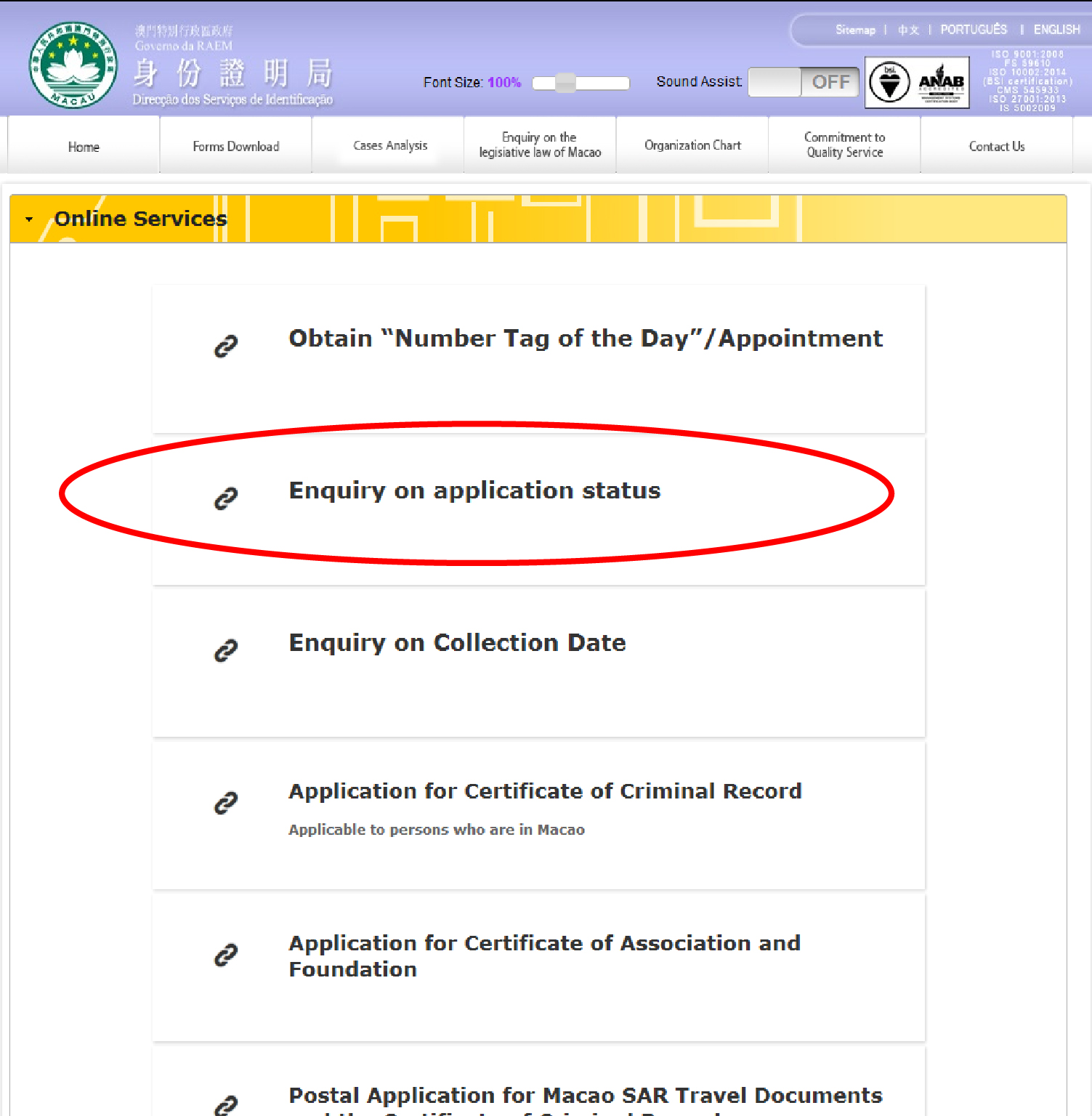The Identification Services Bureau (DSI) introduced a brand new online service for application status enquiry on 30 April 2018, so as to provide convenience for citizens to obtain the information of their application status. In the first phase, the application status enquiry for the resident identity card, travel documents and the Certificate of Criminal Record was launched.