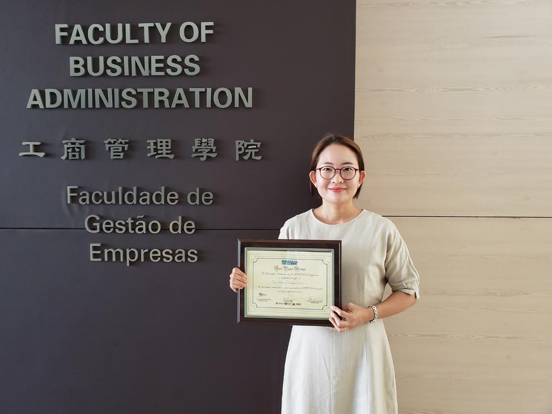 Jacey Choe Jayoung, an assistant professor of international integrated resort management from the Faculty of Business Administration, University of Macau (UM), recently received the Best Paper Award at the Eighth International Conference on Tourism (ICOT), for her paper titled ‘Understanding Food Tourists’ Hierarchical Consumption Value Maps’. The paper is co-authored by Jacey Choe and Oh Munhyang from the School of Hotel and Tourism Management at the Hong Kong Polytechnic University.