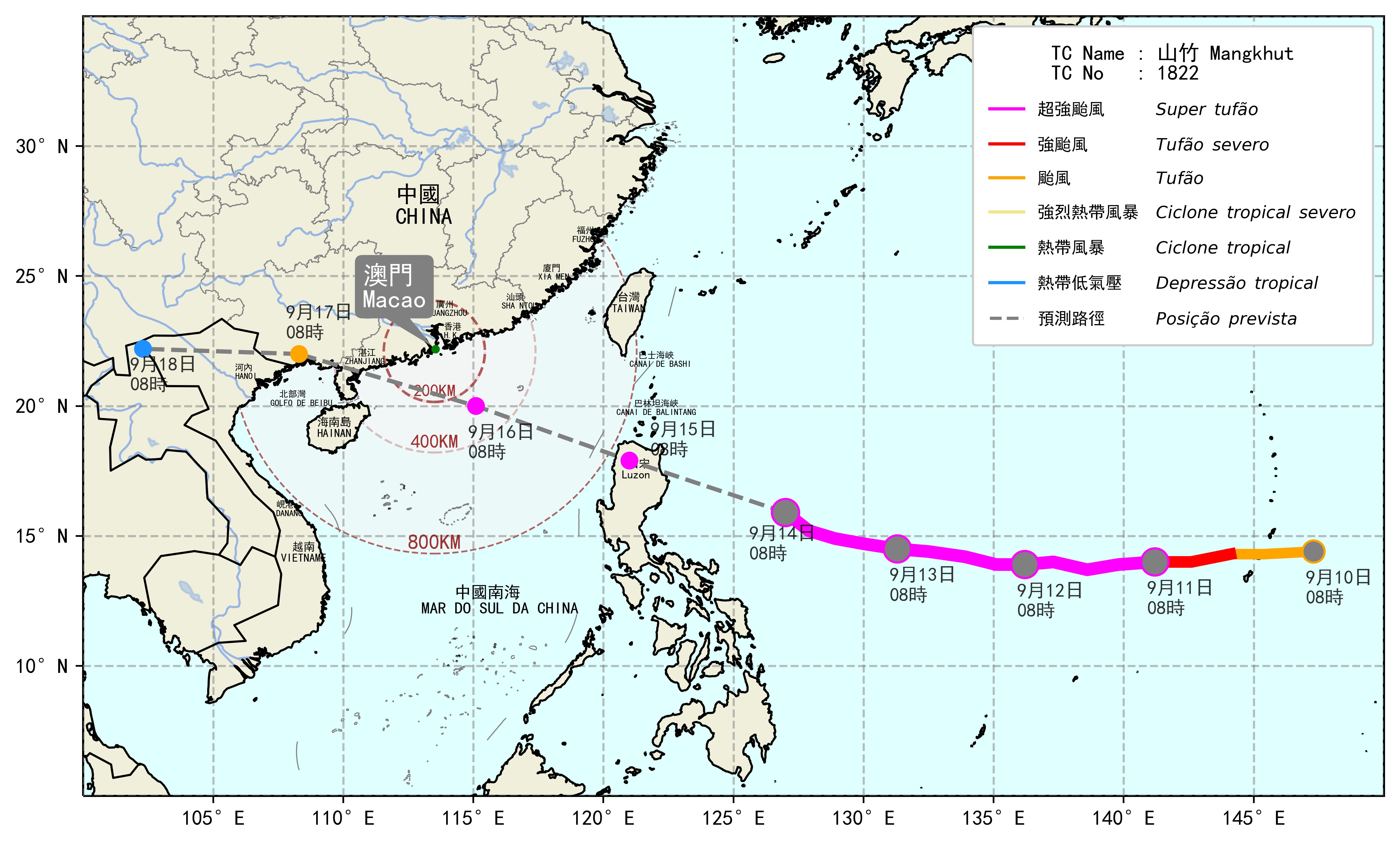 The Super Typhoon “Mangkhut” is now over the western North Pacific. It is well developed with a large gale circle. The maximum wind speed near its center has reached 240km/h. “Mangkhut” is forecasted to enter within 800 km of Macao on 15th morning and Typhoon Signal No.1 will be issued at the same time. Since “Mangkhut” will approach the coast of Guangdong and pose considerable threat to Macao and the Pearl River Delta, Typhoon Signal No.3 is expected to be issued on 15th night. “Mangkhut” will come closest to Macao during daytime one 16th. Frequent squalls and heavy showers are expected and there will also be serious flooding in low-lying areas due to storm surge.
