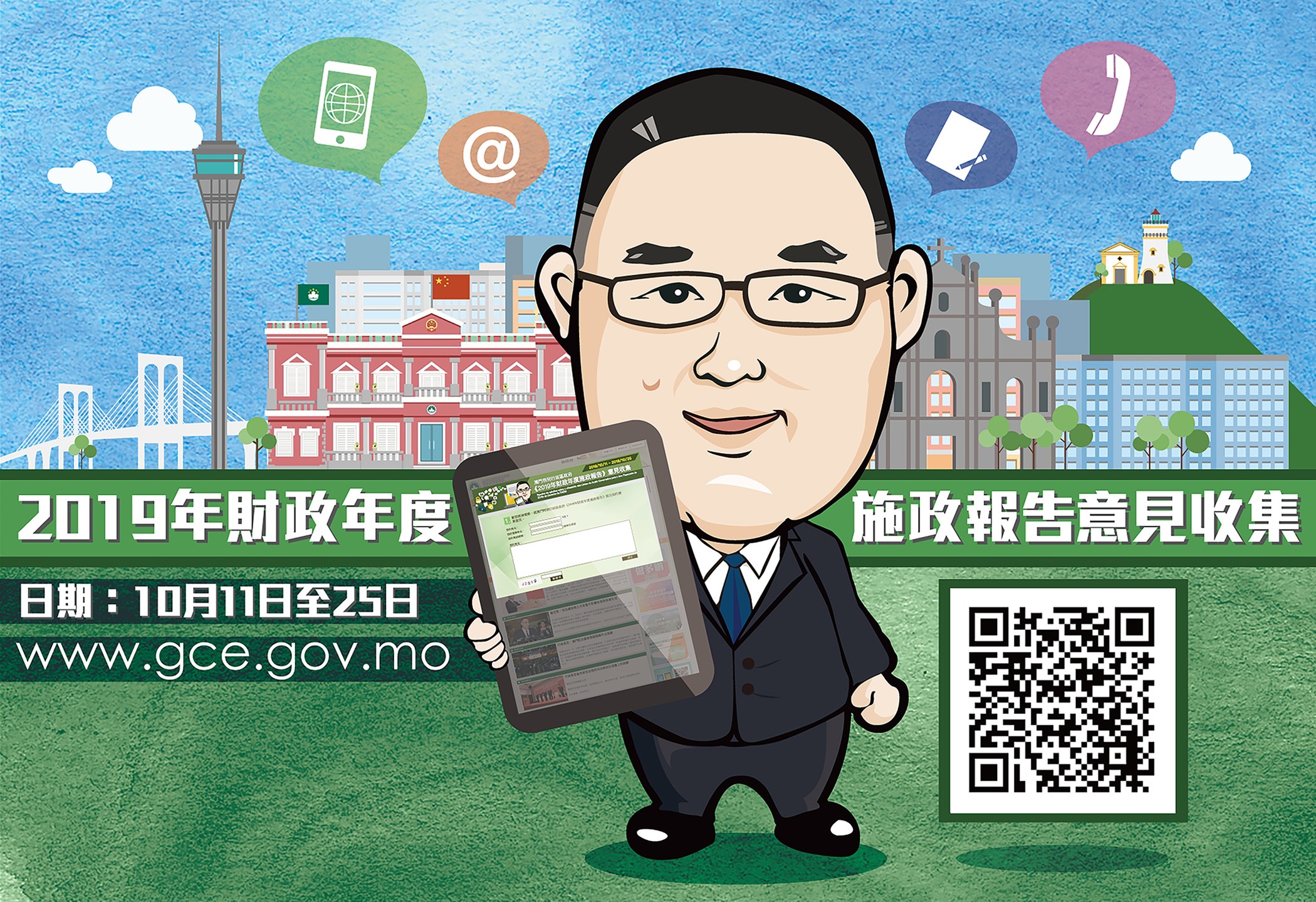 Members of the public are welcome to contribute their opinions either via the official website of the Chief Executive’s Office (www.gce.gov.mo) or via the mobile application “GCE Macao”. Alternatively, opinions can be sent to the Policy Research and Regional Development Bureau, via any of the following methods: by telephone on either +853 2883 9919 or +853 2884 4265; by fax on +853 2882 3426; by email at comment@dsepdr.gov.mo; by post to P.O. Box 1375; or in person (by prior appointment only) to representatives of the Policy Research and Regional Development Bureau at Rua do Desporto, No.185-195, Taipa, Macao.