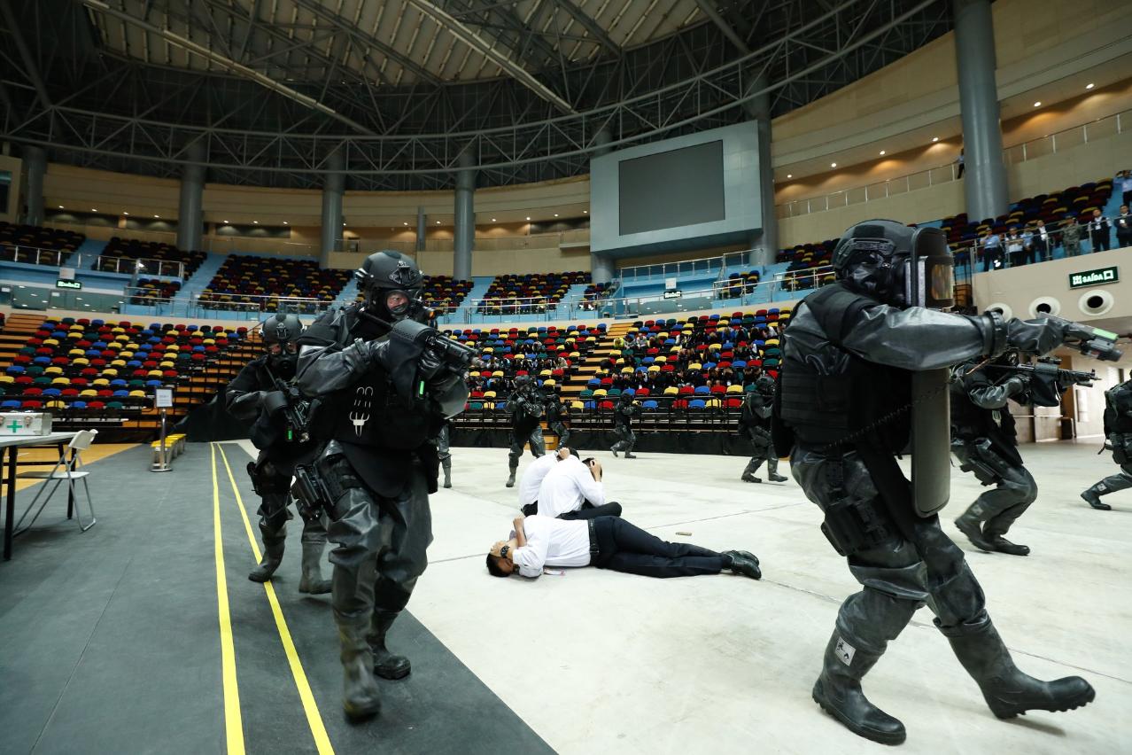 Today’s drill involved a simulation relating to a group of six ‘gunmen’ seeking to enter a concert hall when a 5,000-strong ‘audience’ was inside. After initially being stopped by the concert’s security guards, two ‘suspects’ escaped by vehicle, while the remaining four entered the hall and took the ‘concertgoers’ hostage. In the scenario, the ‘gunmen’ fired several shots and claimed to be in possession of chemical weapons.
