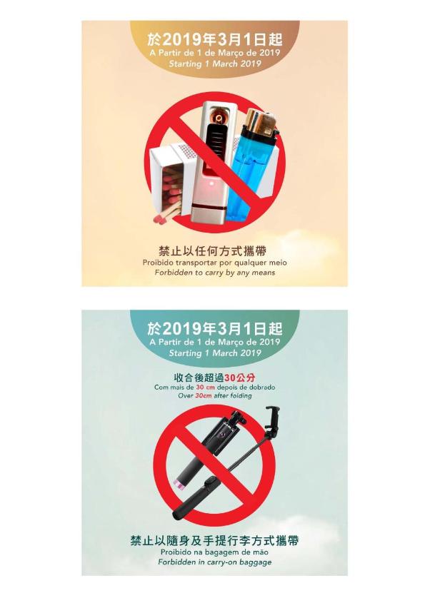 Commencing 01 March 2019, Macau International Airport and the heliport will implement a number of new aviation security requirements which include: 1) lighters (and matches) are forbidden to carry onto an aircraft; 2) selfie stick, camera/video recorder tripod and monopod exceeding 30cm after retraction is forbidden to put in carry-on baggage, and must be transported in checked baggage.