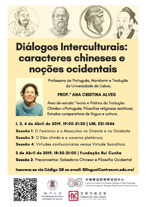 Titled ‘Intercultural Dialogues: Chinese Characters and Western Notions’, this workshop will comprise four sessions. Sessions on 1 April, 3 April, and 4 April will be held in Room 1046, Faculty of Arts and Humanities building (E21), UM, from 7:00pm to 9:30pm. The session on 2 April will be held at Rui Cunha Foundation from 6:30pm to 9:00pm. The session on 4 April will be conducted in English while the other sessions will be in Portuguese. The workshop aims to explore the concepts of ‘self’ and ‘other’ between Chinese characters and Western notions, and to deconstruct the stereotypes and prejudices on Eastern Chinese philosophy and Western philosophy.