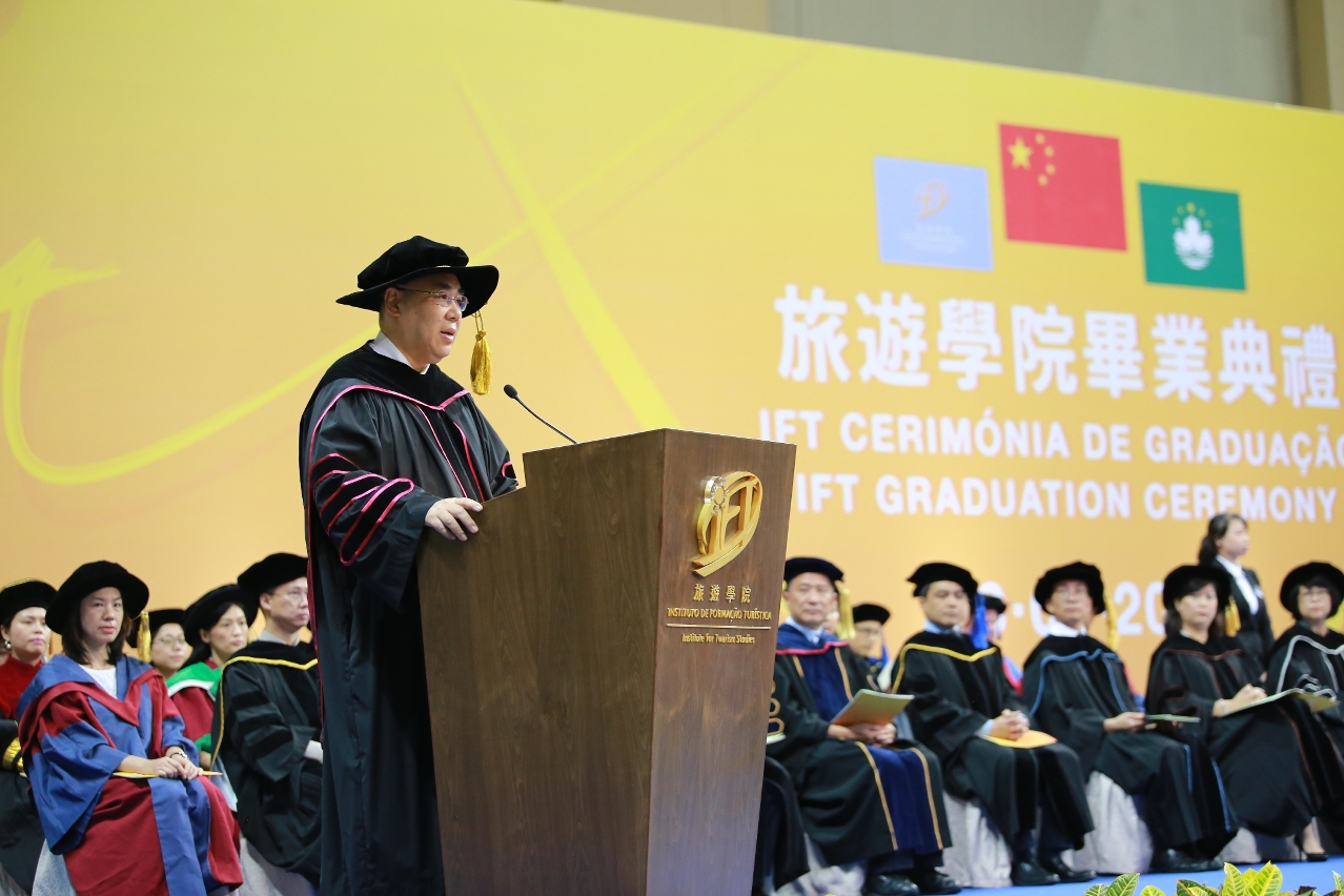 At the Graduation Ceremony, Dr. Chui Sai On expressed Macao Government will continuously provide strong backing to IFT so that it can fully capitalise on its advantages and to strengthen programmes international recognition. In response to the needs of the society, new programmes will be launched to nurture diversified talents for Macao to accelerate the construction of “One Centre, One Platform”, to actively participate in the development of “Belt and Road Initiative” and Greater Bay Area, and to exert greater efforts to build Macao as a tourism education and training base.