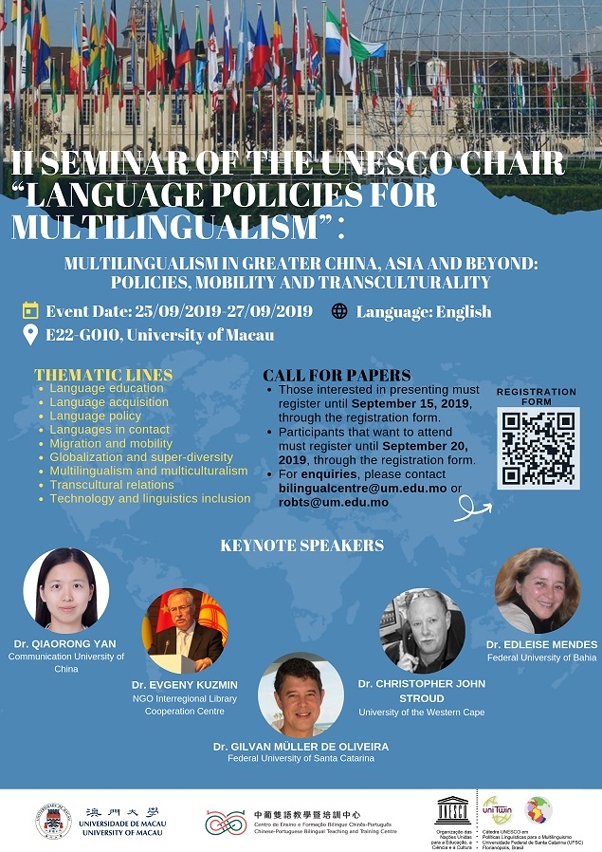 An international seminar titled ‘Multilingualism in Greater China, Asia and Beyond: Policies, Mobility and Transculturality’, co-organised by the Chinese-Portuguese Bilingual Teaching and Training Centre (CPC) under the University of Macau (UM) Department of Portuguese, and the United Nations Educational Scientific and Cultural Organisation (UNESCO) Chair of Language Policies for Multilingualism at UM, will open on Wednesday 25 September. During the event, experts and scholars from different parts of the world with share the latest research results in multilingualism education. All are welcome.