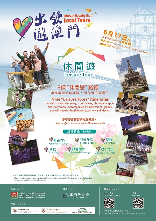 A local tour project entitled “Macao Ready Go! Local Tours” is officially launched on 17 June. Macao residents can sign up for local tours scheduled between 22 June and 30 September at the outlets of all travel agencies under the umbrella of the project. Each participant will be subsidized 280 patacas per tour participation, and is entitled to a maximal subsidy of 560 patacas granted by the project. The Macao Special Administrative Region Government hopes that the project “Macao Ready Go! Local Tours” can lead to progressive resumption of tourism activities in Macao in parallel with the city’s scheme for economic recovery.