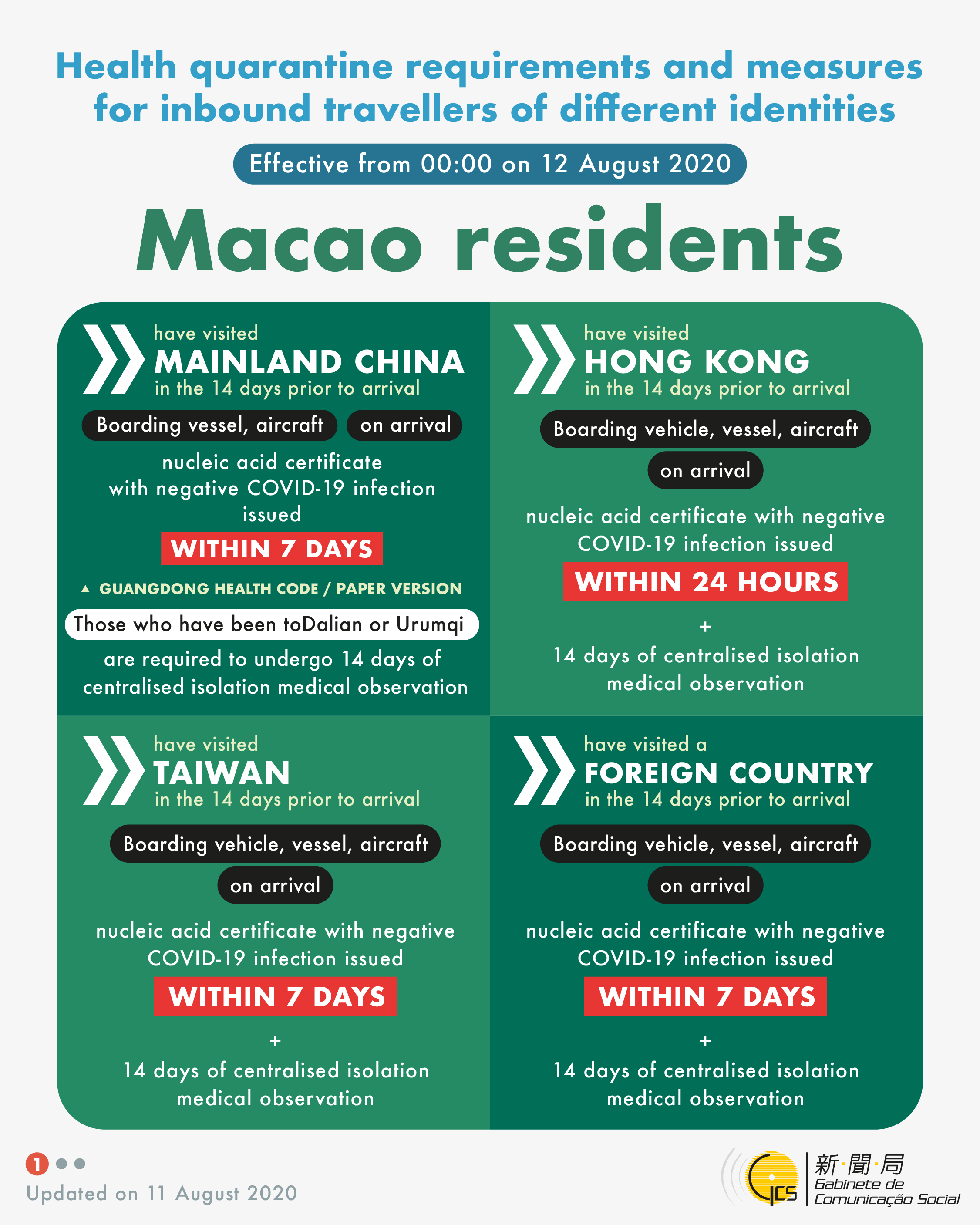 Health quarantine requirements and measures for inbound travellers of different identities, updated on 11 August 2020.