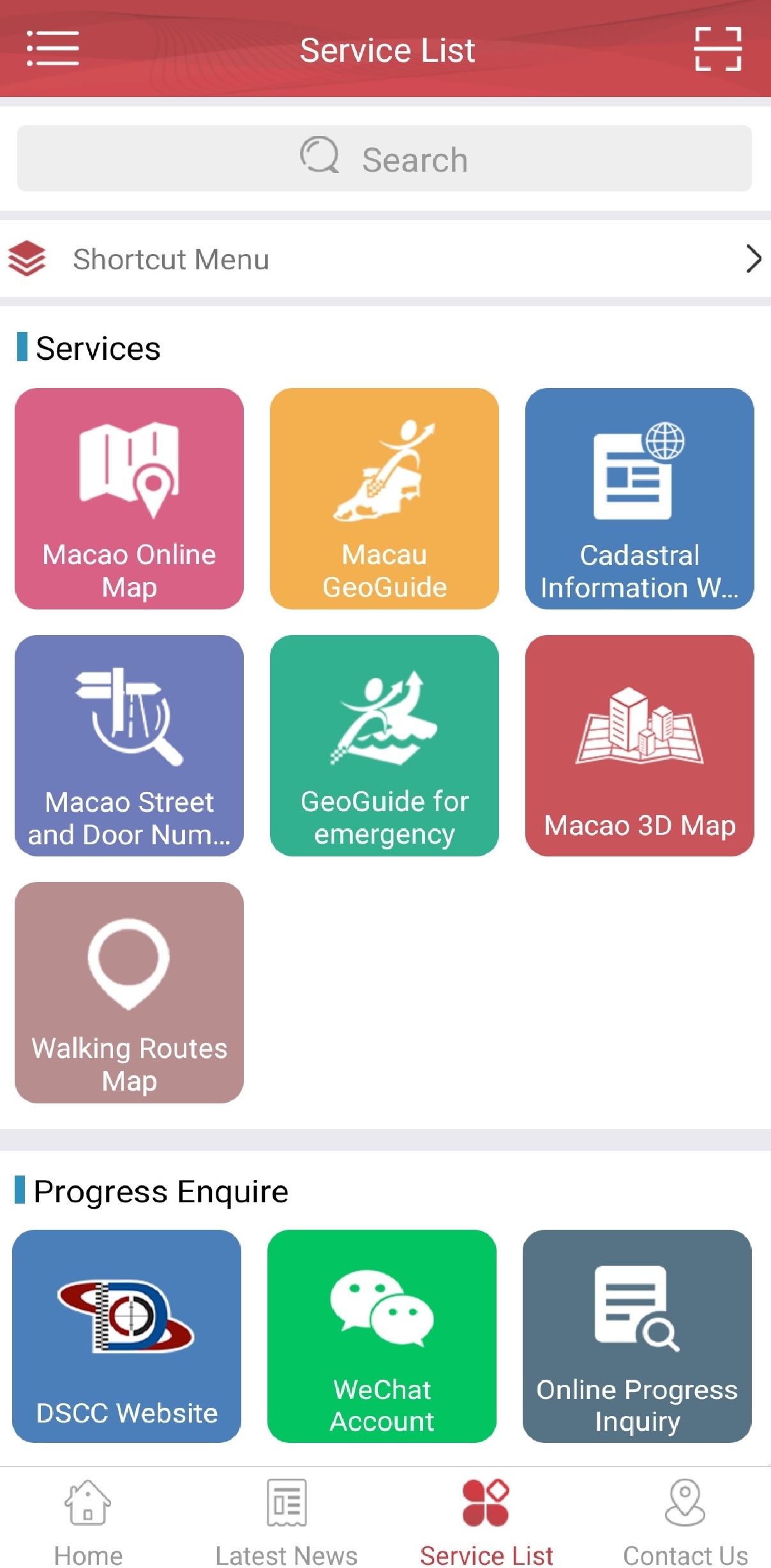 The “Information Center of DSCC” integrates the service information provided by DSCC, as well as practical information such as online process inquiry and various geographic information systems links. In order to let the applicants to view their application status, the App is equipped with online process inquiry function so that the applicants can instantly check the progress of “One-stop Service” and “Online Shopping Service”. In addition, the App also has built-in geographic information systems links including the latest published “Macao 3D Map”, “Macao Online Map”, “Cadastral Information Website”, “Macau GeoGuide”, “GeoGuide for Emergency” and “The Walking Routes Map” etc., providing a comprehensive service information platform of DSCC.