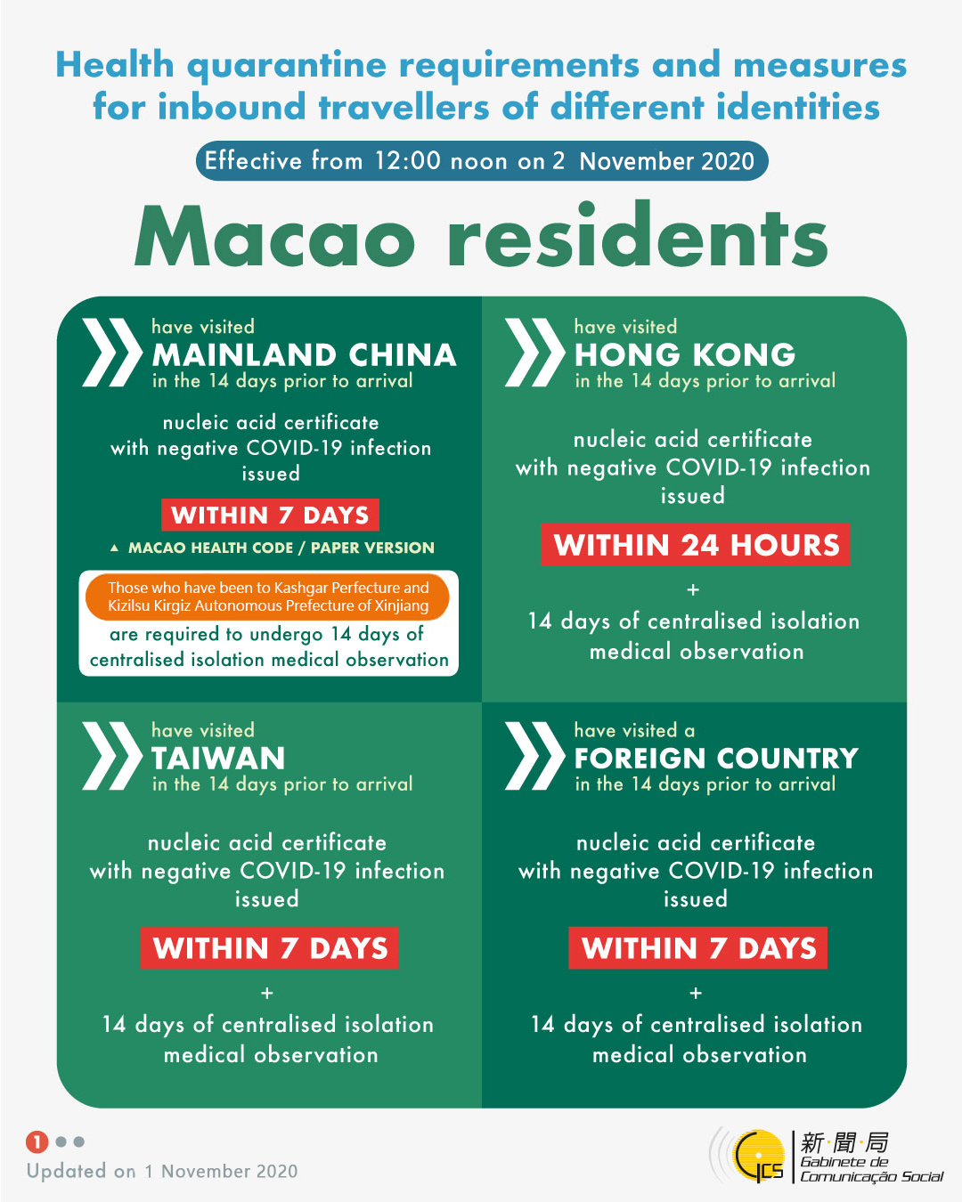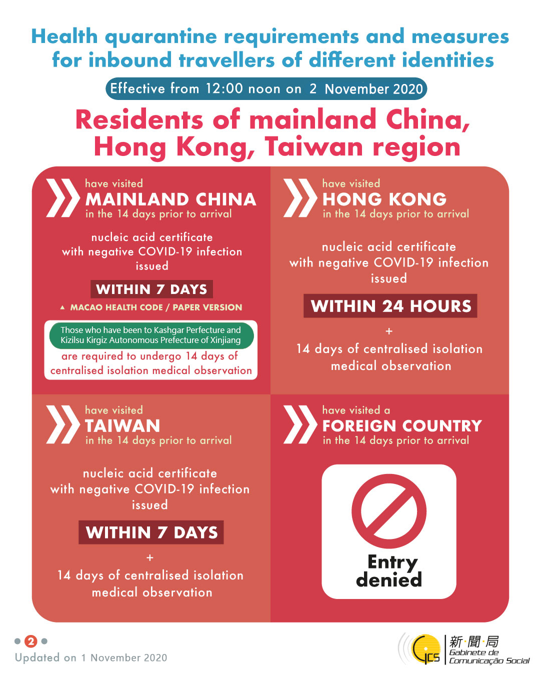 Health quarantine requirements and measures for inbound travellers of different identities, updated on 1 November 2020.