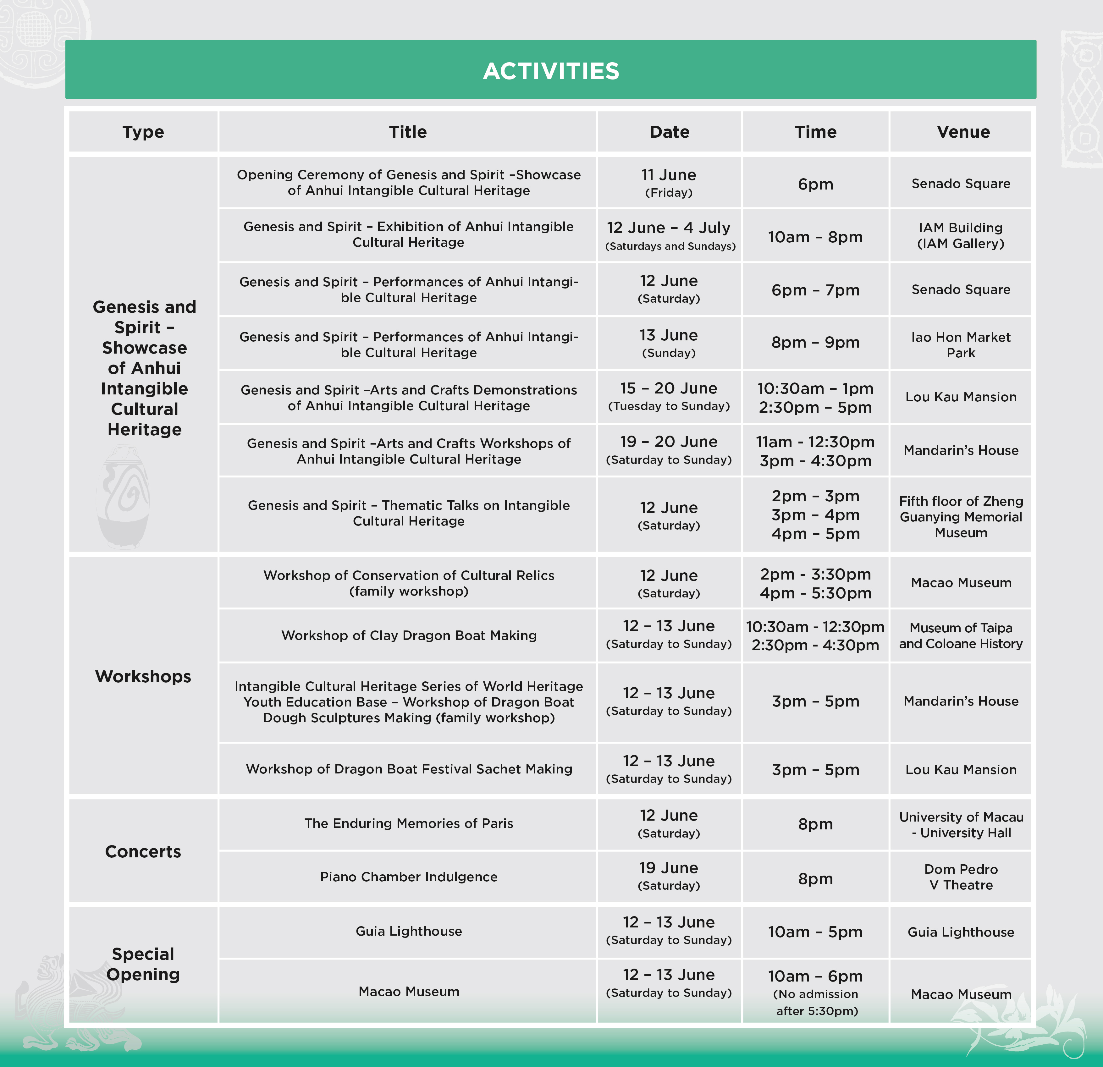 A number of workshops will also be held at IC’s cultural facilities, including the Workshop of Conservation of Cultural Relics (family workshop) at the Macao Museum on 12 June, the Workshop of Clay Dragon Boat Making at the Museum of Taipa and Coloane History, Intangible Cultural Heritage Series of World Heritage Youth Education Base – Workshop of Dragon Boat Dough Sculptures Making (family workshop) at the Mandarin’s House, and the Workshop of Dragon Boat Festival Sachet Making at the Lou Kau Mansion, which will be held on 12 and 13 June. Some of the aforementioned activities and workshops of the “Genesis and Spirit” series require advance registration; interested parties may register from 26 May through the “Activities Registration System” on IC’s website at www.icm.gov.mo/eform/event. Seating for the thematic talks will be available on a first-come, first-served basis. If the number of registrants in the workshops exceeds the maximum number of participants, participants will be selected by drawing lots.