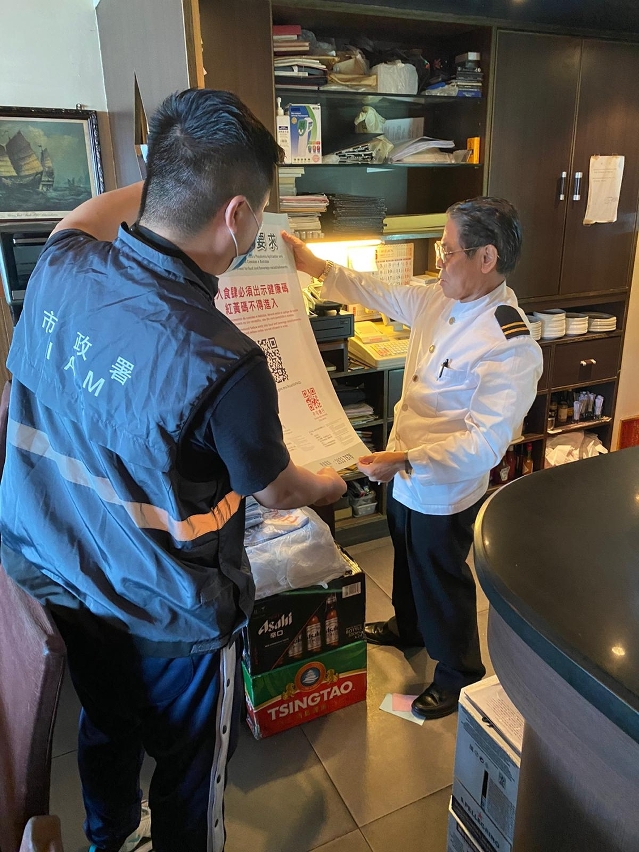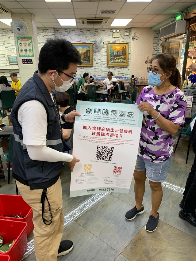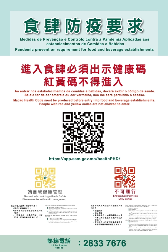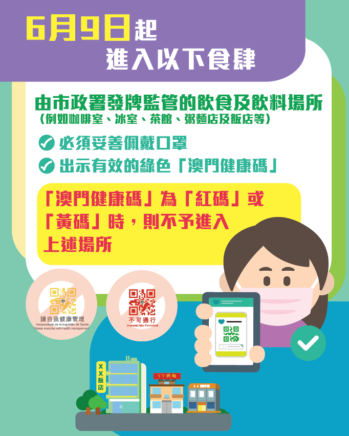 The Municipal Affairs Bureau (IAM) makes timely adjustments to relevant pandemic prevention measures in view of the development of novel coronavirus pneumonia. Starting from tomorrow (June 9), the public is required to produce a valid green “Macao Health Code” for entry into the beverage establishments and the food and beverage establishments of Category 4 and Category 5 licensed and regulated by IAM, besides complying with the existing pandemic prevention measures. Individuals with red and yellow codes are not allowed to enter. Today IAM has informed the license holders of the venues and consumers of the relevant measure through SMS messages, distribution of posters, etc.