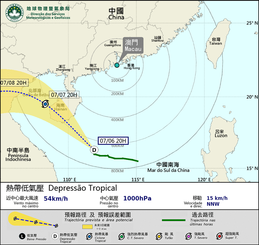 The tropical depression over the central part of the South China Sea is expected to move in the northwest direction, towards Hainan Island. As the tropical depression is at a distance far away from Macao, the possibility of issuing higher tropical cyclone signals remains low in the early morning tomorrow(7th). As it is not in the high phase of the astronomical tide, the possibility of storm surge will be low.