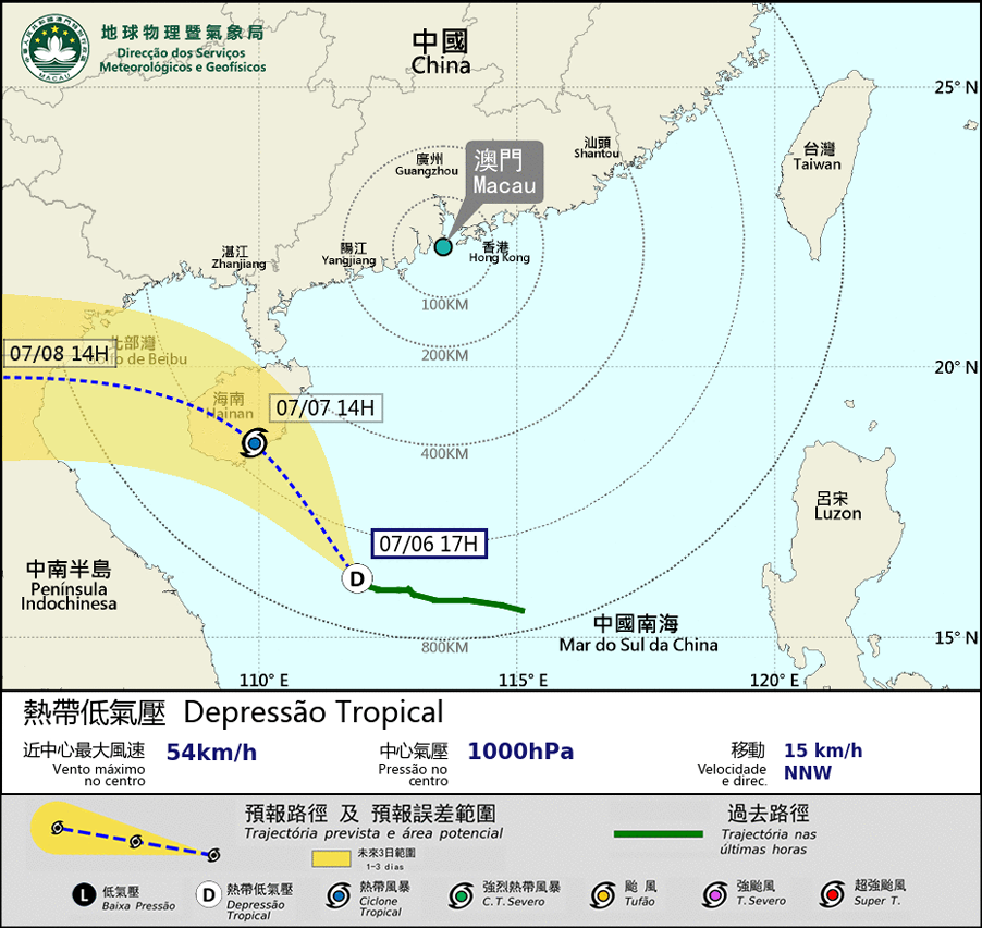 The tropical depression located over the Taiwan Strait has weakened and dissipated this afternoon. Meanwhile, the tropical depression over the central part of the South China Sea is expected to intensify today and tomorrow. It will move in the northwest direction, towards Hainan Island tomorrow morning. As the tropical depression is at a distance far away from Macao, the possibility of issuing higher tropical cyclone signals remains low today. On the other hand, it is not in the high phase of the astronomical tide, so the possibility of storm surge will be low.