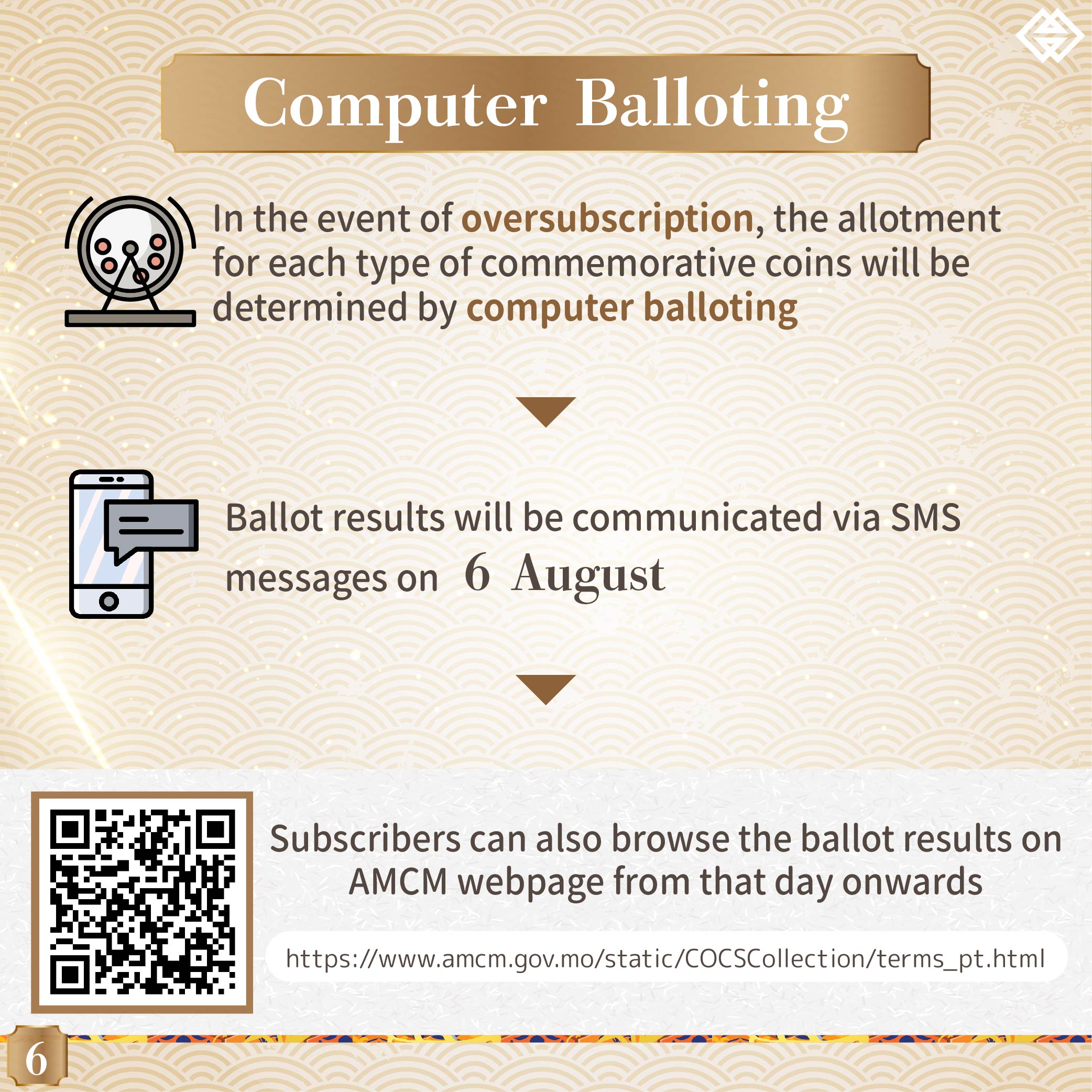 Each subscriber can only conduct a single subscription, for a maximum of one piece of each of the three said commemorative coins. In the event of oversubscription, the allotment for each type of commemorative coins will be determined by computer balloting. Ballot results will be communicated via SMS messages on 6 August 2021. Subscribers can also browse the ballot results on AMCM webpage from that day onwards.