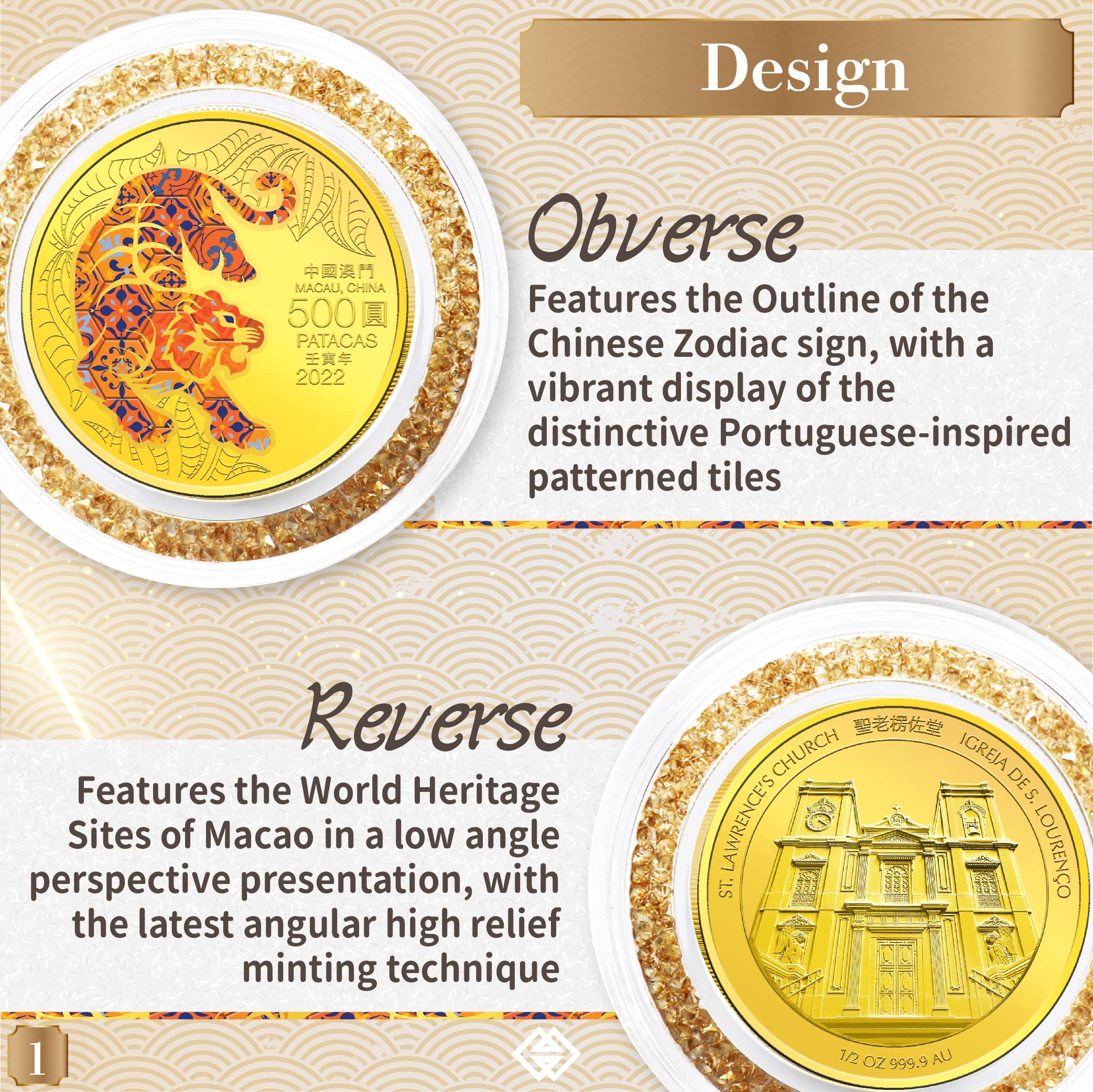 The obverse design of 2022 Year of the Tiger commemorative coins features the outline of the Chinese Zodiac sign, portrayed with a vibrant display of the distinctive Portuguese-inspired patterned tiles. The reverse design features a World Heritage Site of Macao in a low angle perspective presentation, sculpted in the latest angular high relief minting technique. The Year of the Tiger commemorative coins comprise a 1 oz and a 5 oz Silver Proof coin as well as a 0.5 oz Gold Proof coin. The selling price of the coins is MOP1,230, MOP7,200 and MOP15,000 respectively.