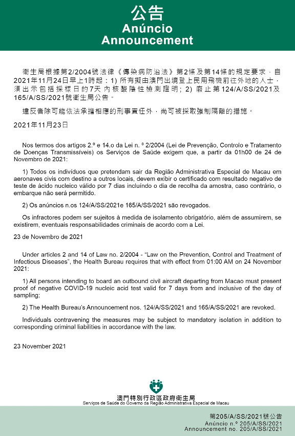 The measure amounts to a relaxation of previous Macao test rules regarding outbound flights, and became effective at 1am today (24 November). People intending to leave Macao should pay close attention to any additional requirements that might be in place for travellers at their chosen destination. For example, people travelling from Macao to Beijing are currently required to present a nucleic acid test issued within 48 hours.