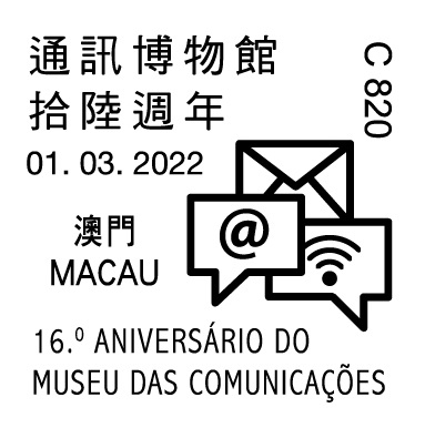 To celebrate the 16th Anniversary of Communications Museum, Macao Post and Telecommunications Bureau announces that a Temporary Post Counter will be set up at the Philatelic Shop of General Post Office and Communications Museum on 1st March 2022 to provide the commemorative postmark cancellation service for the “16th Anniversary of Communications Museum”. Opening hours are as follows:
