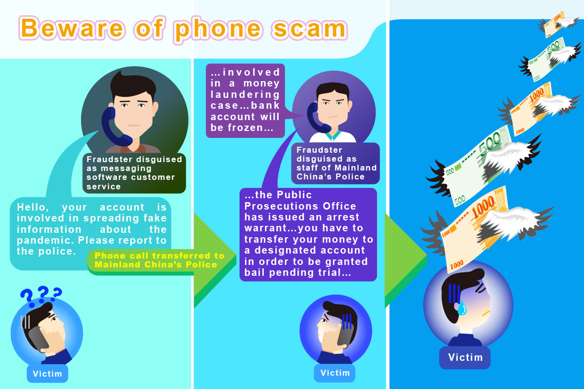Members of the public informed the Judiciary Police regarding suspected fraudulent calls from an alleged customer service staff of a mobile phone messaging software, who spoke in Putonghua, claiming that their mobile phone account was involved in spreading fake information about the pandemic and the call was transferred to an alleged staff of Mainland China’s Police. The staff told them that their bank account would be frozen as they were involved in a financial crime. They were also told that the prosecutor had issued an arrest warrant and they were required to transfer their money to a designated "security account" in order to be granted bail pending trial. Call recipients immediately hung up on the caller on suspicion of the call’s fraudulent nature and reported the incident to the Judiciary Police.