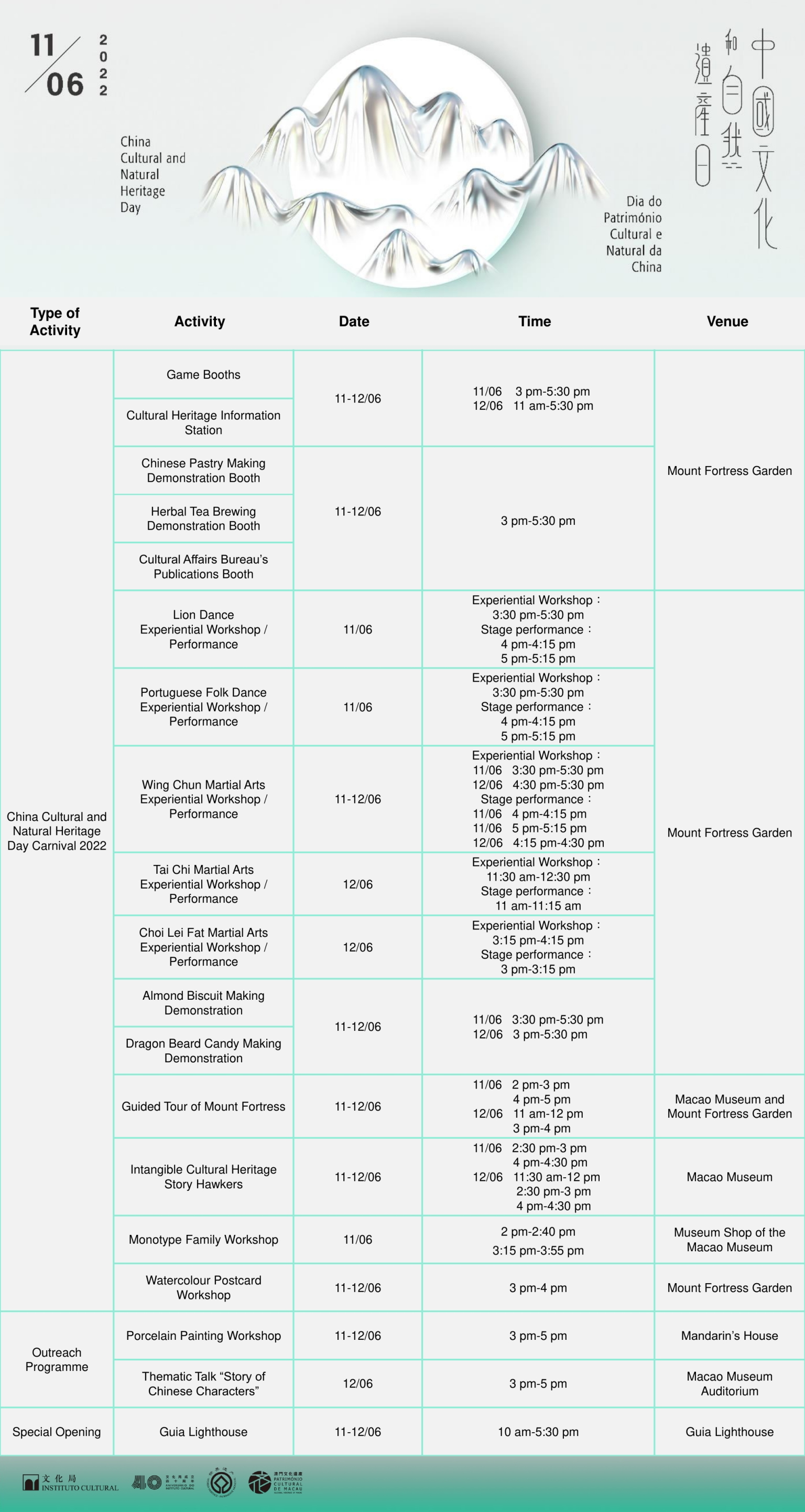 The “China Cultural and Natural Heritage Day Carnival 2022” will be held from 3pm to 5:30pm on 11 June and from 11am to 5:30pm on 12 June at the Mount Fortress Garden and the Macao Museum. In addition to a range of thematic game booths, activities and demonstrations of making almond cookies and dragon beard candies, the carnival also features stage performances of lion dance, Portuguese folk dance, as well as Wing Chun, Taichi and Cho Lei Fat Martial Arts. Participants can experience different activities of intangible cultural heritage under the guidance of instructors. People of all ages are welcome to join free of charge.