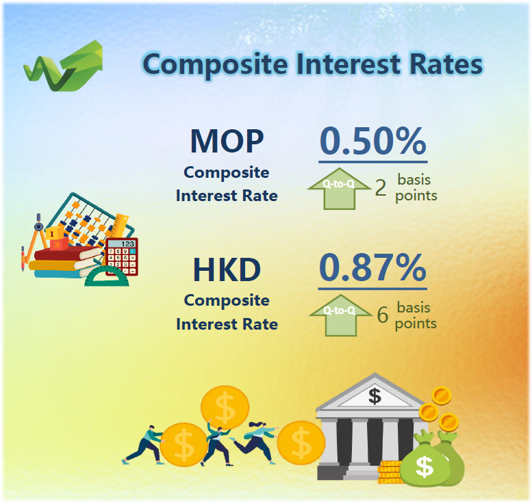 At end-March 2022, the composite interest rates for MOP and HKD rose 2 basis points and 6 basis points, from 0.48% and 0.81% at end-December 2021 to 0.50% and 0.87% respectively.