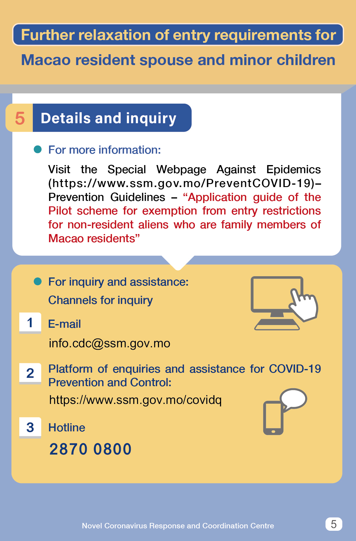 Taking into account the actual needs of local residents and assessing the epidemic risks and changes in relevant countries, the Novel Coronavirus Response and Coordination Centre (hereinafter referred to as the “Centre”) announces, in accordance with the stipulations in clause 3 of Chief Executive Dispatch No. 64/2022, that with effect from 30 May 2022, non-resident spouse and minor children of Macao residents who are unqualified to enter Macao under other entry restrictions exemption schemes may, subject to prior authorization from the health authorities and the prerequisite of fulfilling other entry conditions, enter into the Macao Special Administrative Region.