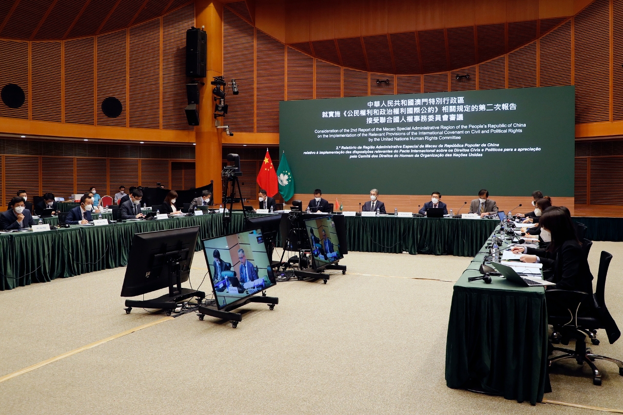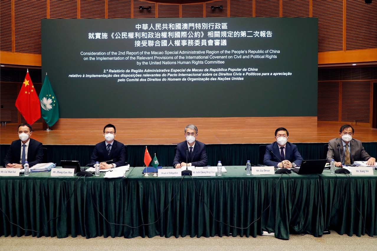 From 13 July to 15 July, the Macao SAR Government’s second report on the implementation of the relevant provisions of the International Covenant on Civil and Political Rights was considered by the United Nations Human Rights Committee through video conference. The delegation was headed by the Secretary for Administration and Justice, Mr. André Cheong Weng Chon, and joined by representatives of the Office of the Secretary for Security, the Government Information Bureau, the Legal Affairs Bureau, the Labour Affairs Bureau, the Health Bureau and the Social Welfare Bureau.