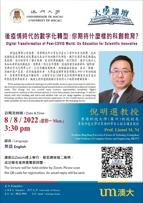 The University of Macau (UM) on 8 August (Monday) will hold a talk titled ‘Digital Transformation of Post-COVID World: On Education for Scientific Innovation’ as part of the University Lecture Series. Lionel Ni, president of the Hong Kong University of Science and Technology (Guangzhou) and chair professor of computer science and engineering at the Hong Kong University of Science and Technology (HKUST), will be the keynote speaker. During the talk, he will discuss scientific innovation education and talent nurture against the backdrop of digital transformation.