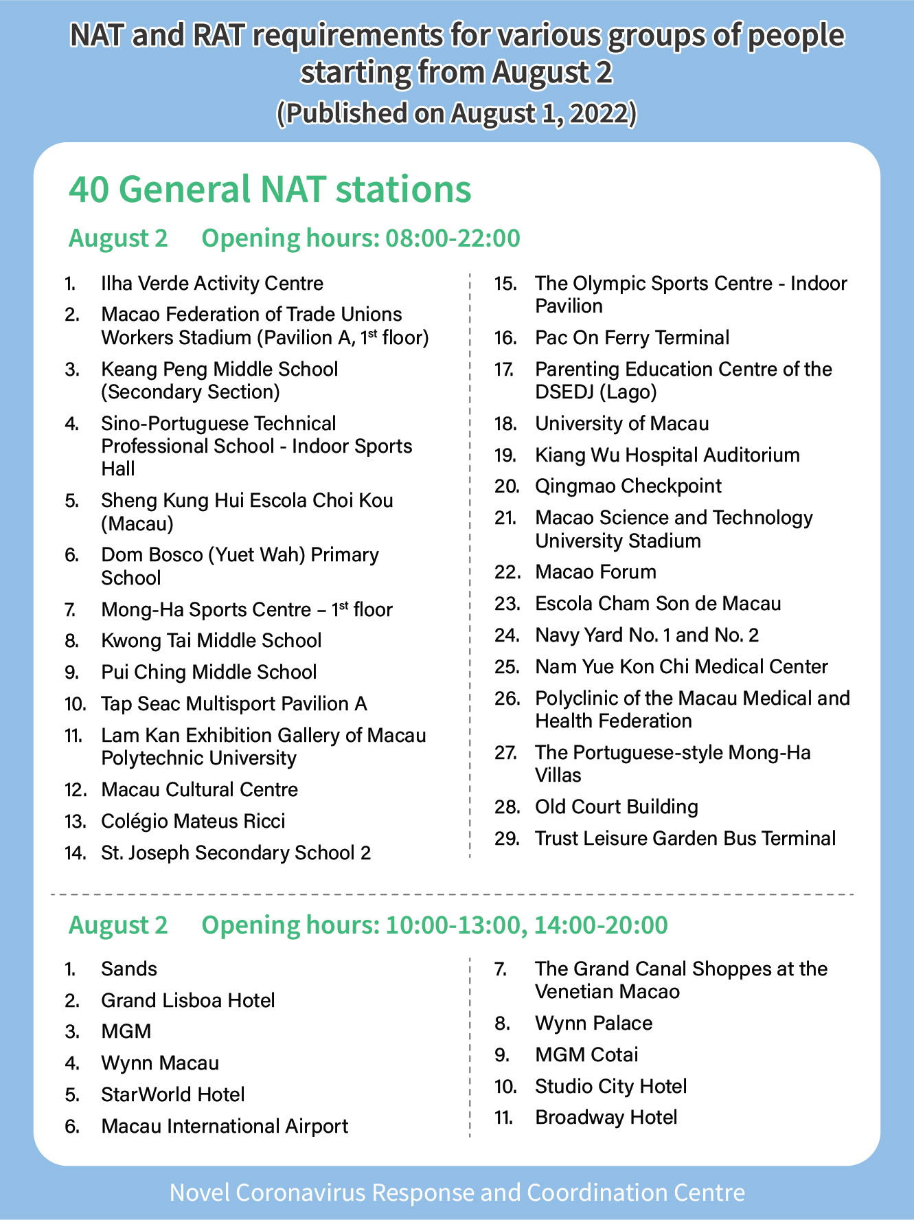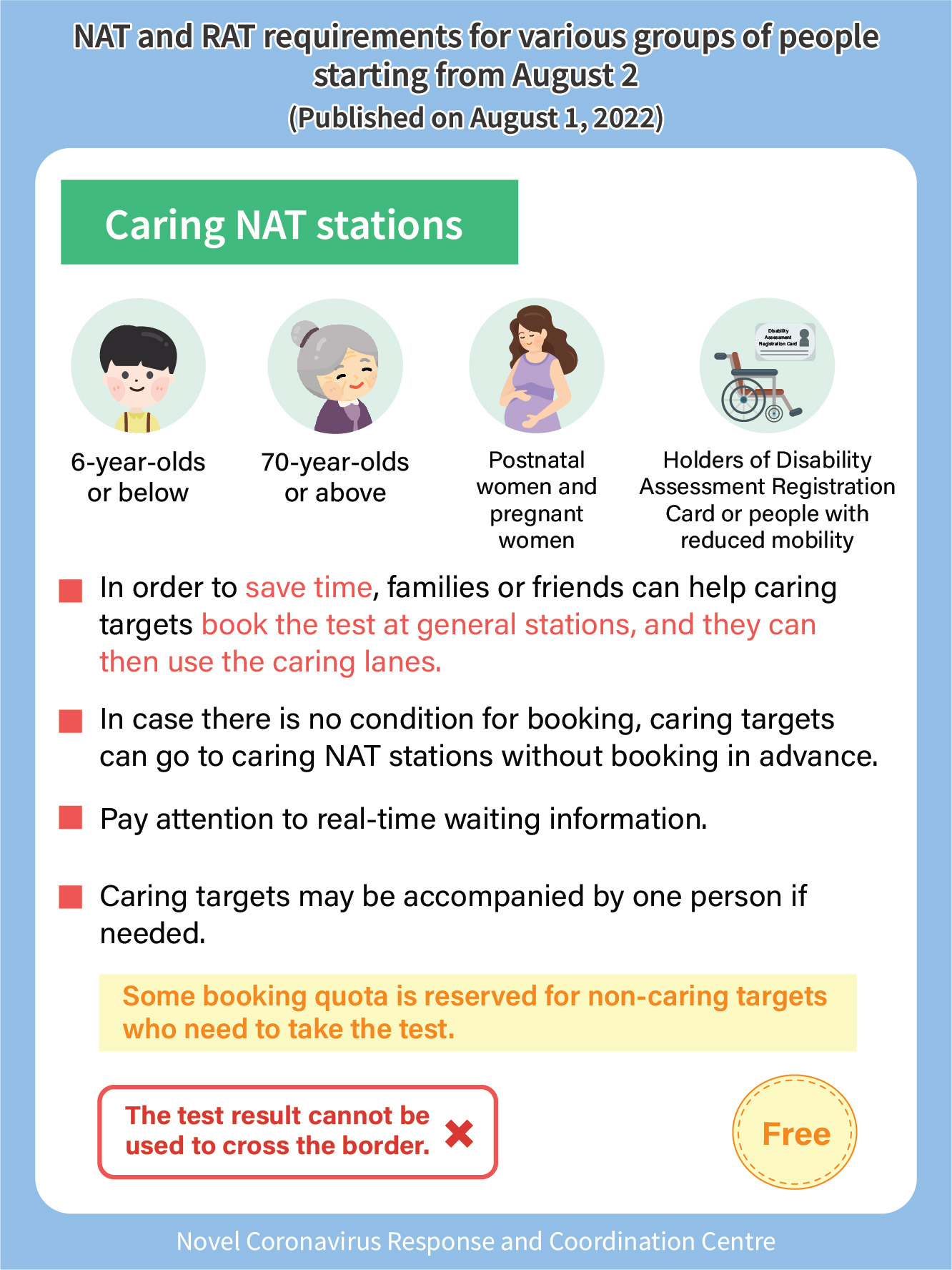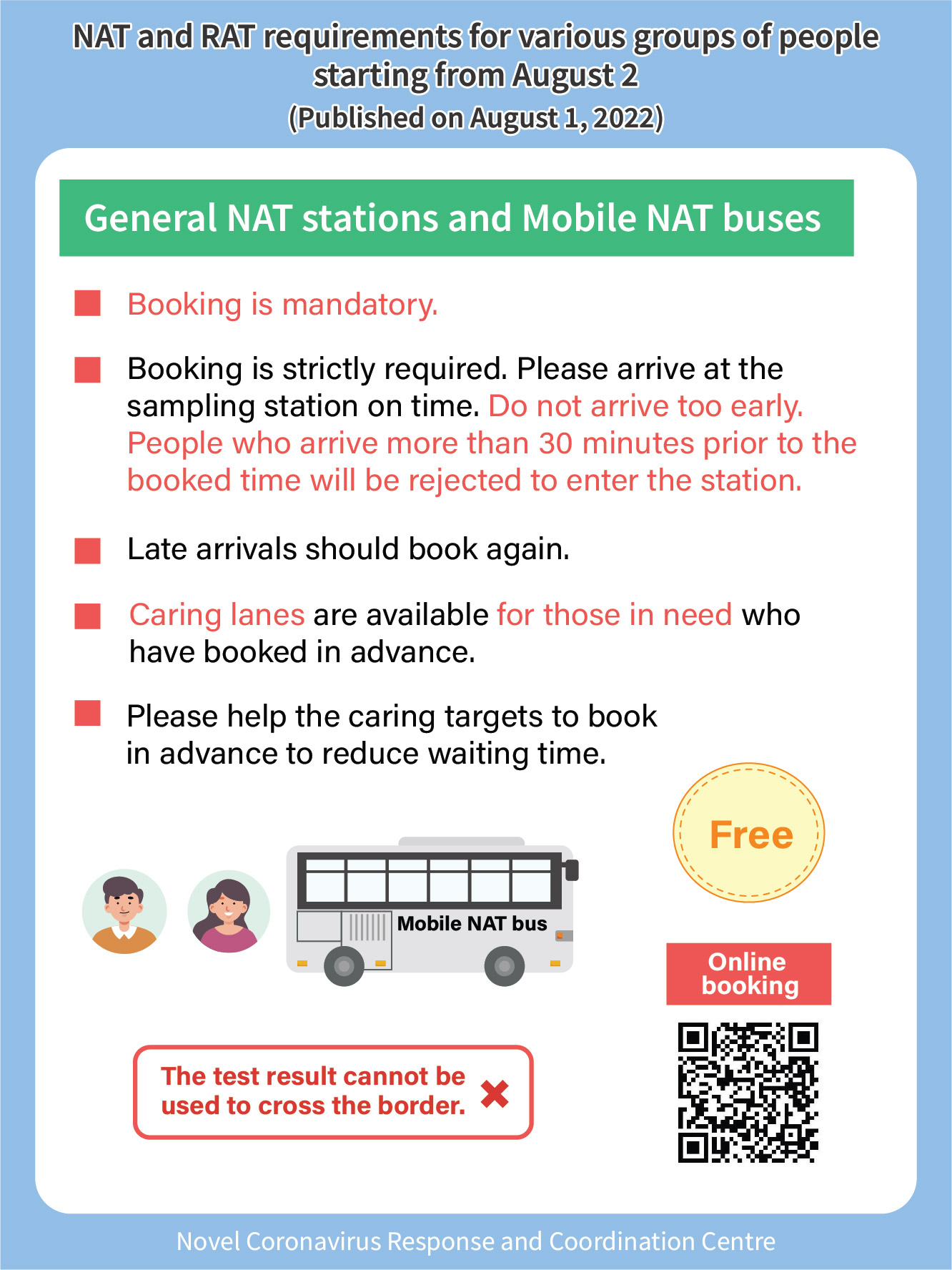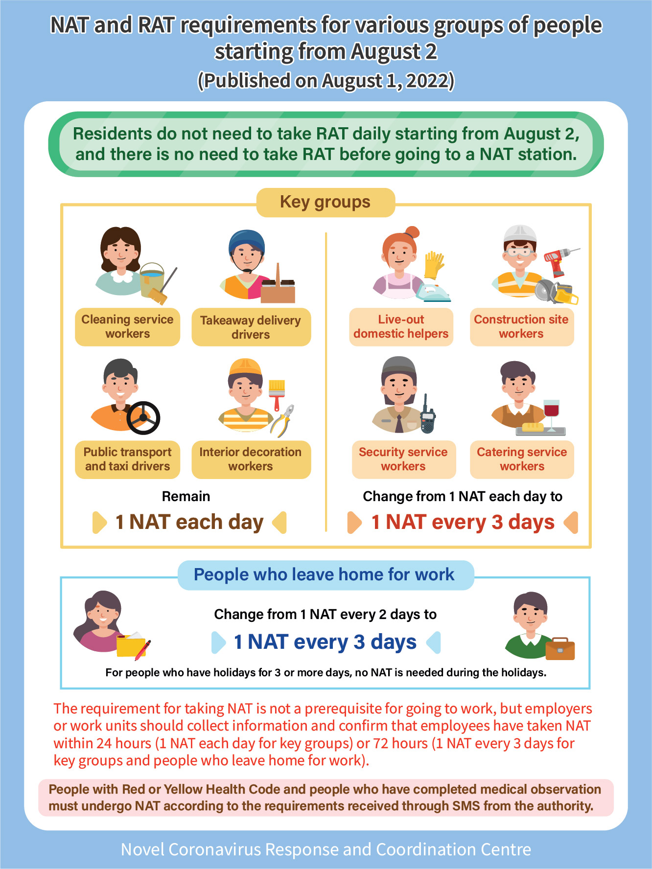 The Novel Coronavirus Response and Coordination Centre announces that after risk analysis, starting tomorrow (2 August, Tuesday), the nucleic acid testing (NAT) arrangement for key groups and those who need to leave home for work will be adjusted as follows: