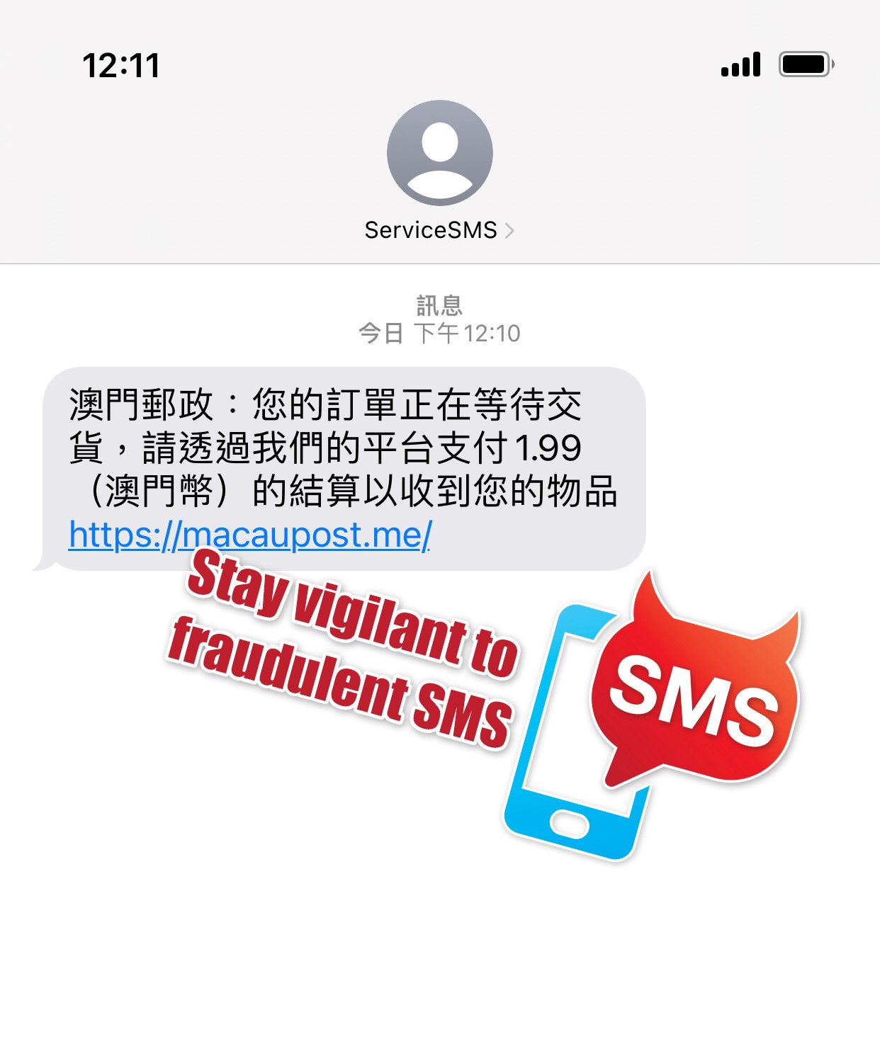 Recently, some citizens reported that they have received SMSs sent in the name of Macao Post and Telecommunications Bureau (CTT), soliciting the recipient to click the embedded link to pay additional fee for their parcels and provide personal information.