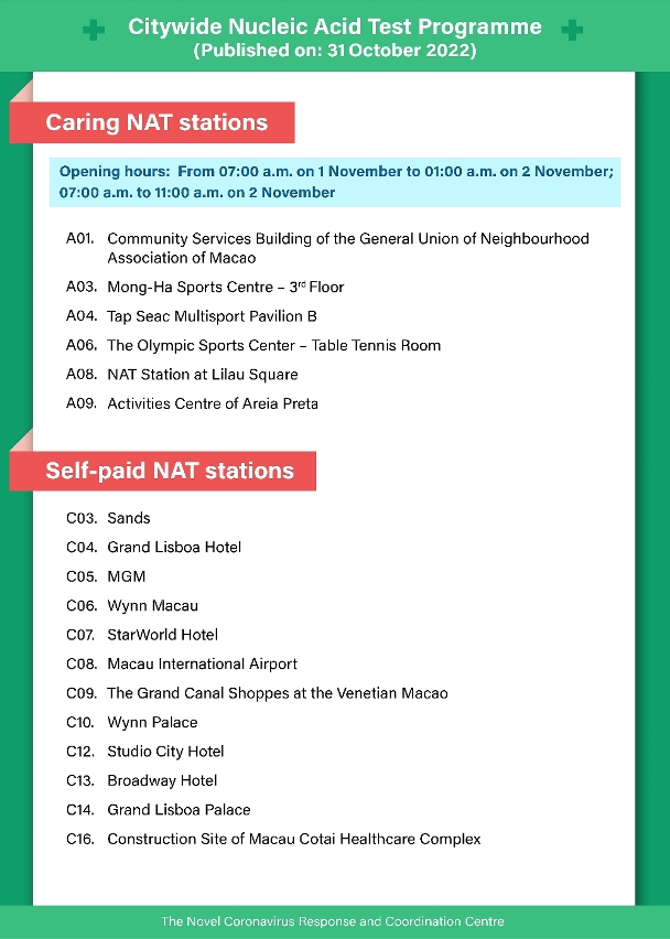 - The appointment system will be put into operation from 21:00 on 31 October. Free test booking link (result cannot be used for border-crossing purposes): https://eservice.ssm.gov.mo/allpeoplernatestbook.