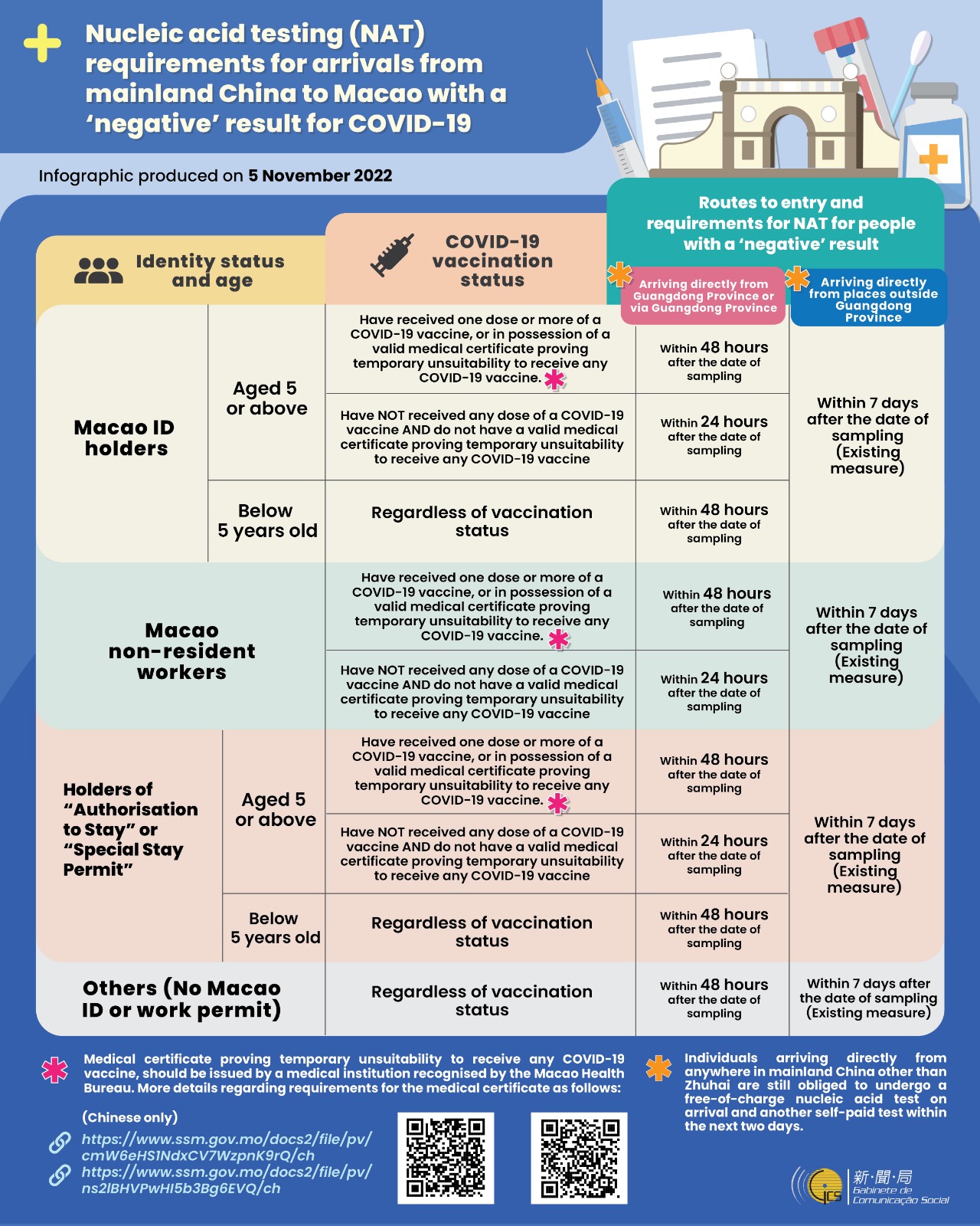 [Infographic] Nucleic acid testing (NAT) requirements for arrivals from mainland China to Macao with a ‘negative’ result for COVID-19