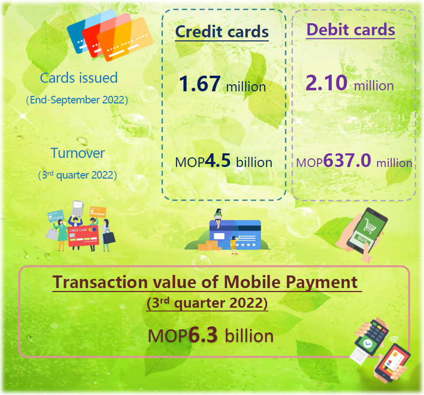 For the third quarter of 2022, the credit card turnover totalled MOP4.5 billion, a decline of 7.8% year-on-year. The cash advance turnover was MOP129.6 million, occupying 2.9% of total credit card turnover. The number of credit card transactions reached 6.9 million, a decrease of 1.9% from the previous year. Credit card repayments, in which payments for interest and fees are included, dropped by 11.6% from the previous year to MOP4.5 billion. Meanwhile, the number of debit card transactions other than cash withdrawals and the debit card turnover reached 301.8 thousand and MOP637.0 million respectively.