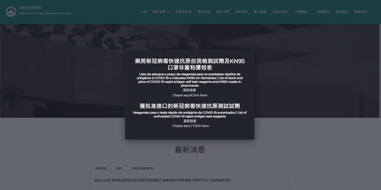 In response to the latest pandemic development and to assist public in the purchasing of COVID-19 rapid antigen test kits and KN95 masks, the Pharmaceutical Administration Bureau (ISAF) will make available on its website (www.isaf.gov.mo) every two hours information regarding the stock of COVID-19 rapid antigen test kits and KN95 masks in pharmacies in Macao.