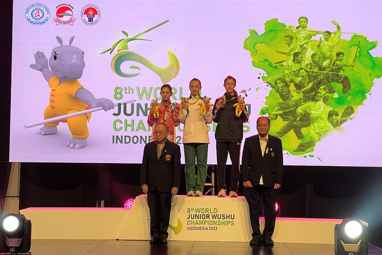 Macao Polytechnic University students Wong Weng Ian and Kuong Chi Hin represented the Macao SAR and competed at the 8th World Junior Wushu Championships (WJWC) held on 2-10 December 2022 in Indonesia. With their excellent technical performance, these two young athletes won one gold, one silver and two bronze medals. Wong Weng Ian triumphed in the Female Spear Event with the highest score of 9.169, and thus won a gold medal, the second gold for the Macao team at this championship. She also won two bronzes at Swords and Long Fist events. Kuong Chi Hin won a sliver for Macao in the Male Swords Event.