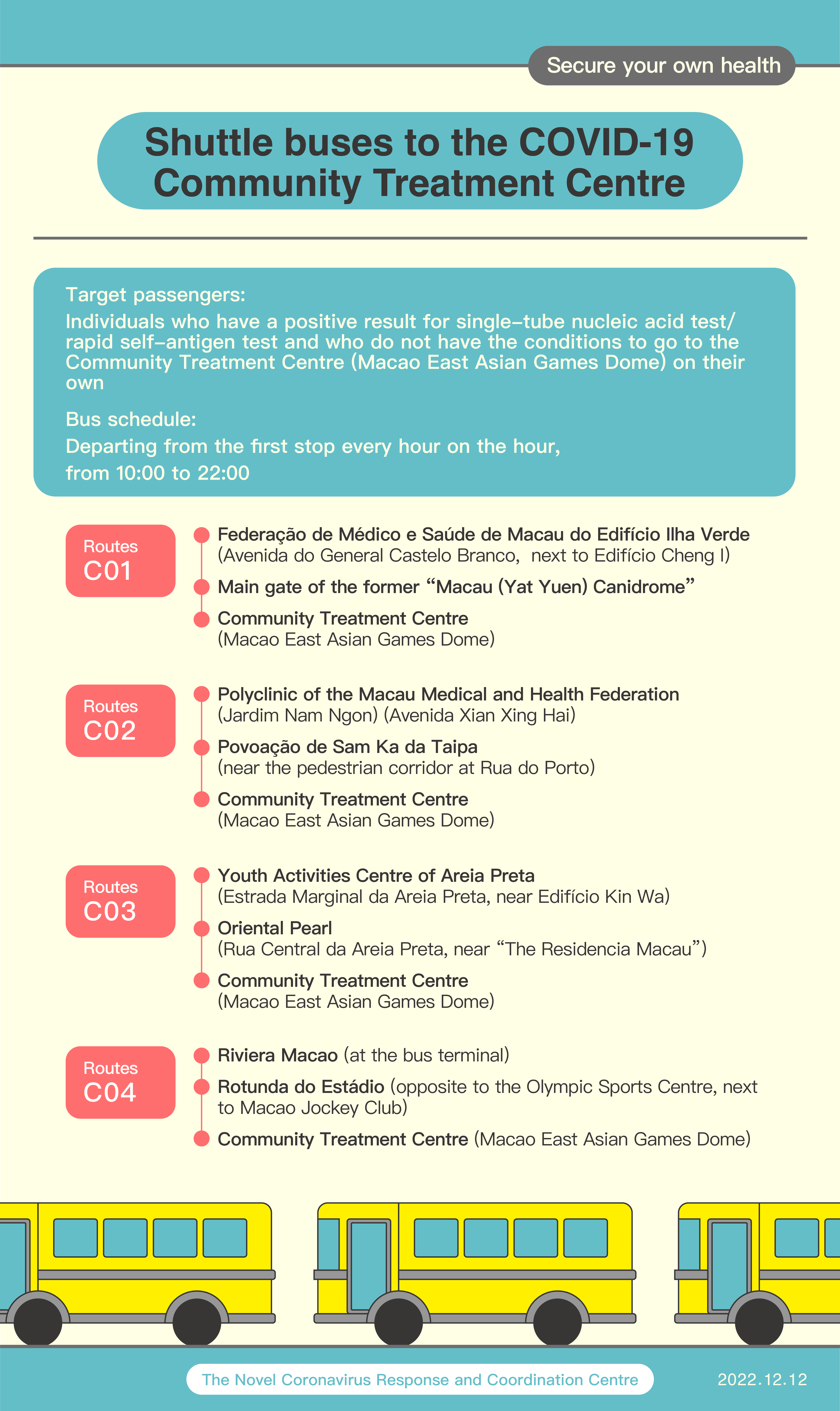 The Novel Coronavirus Response and Coordination Centre states that shuttle buses, with 8 pick-up points, will be arranged in the next two days (12 - 13 December), so as to facilitate individuals infected with COVID-19 to go to the Community Treatment Centre (Macao East Asian Games Dome) for medical consultation. Target passengers are individuals who have a positive result for single-tube nucleic acid test/ rapid self-antigen test and who do not have the conditions to go to the Community Treatment Centre (Macao East Asian Games Dome) on their own. Shuttle buses with more pick-up points will be arranged from Wednesday (14 December) onwards for individuals infected with COVID-19 to go to the community outpatient clinics to seek medical consultation.